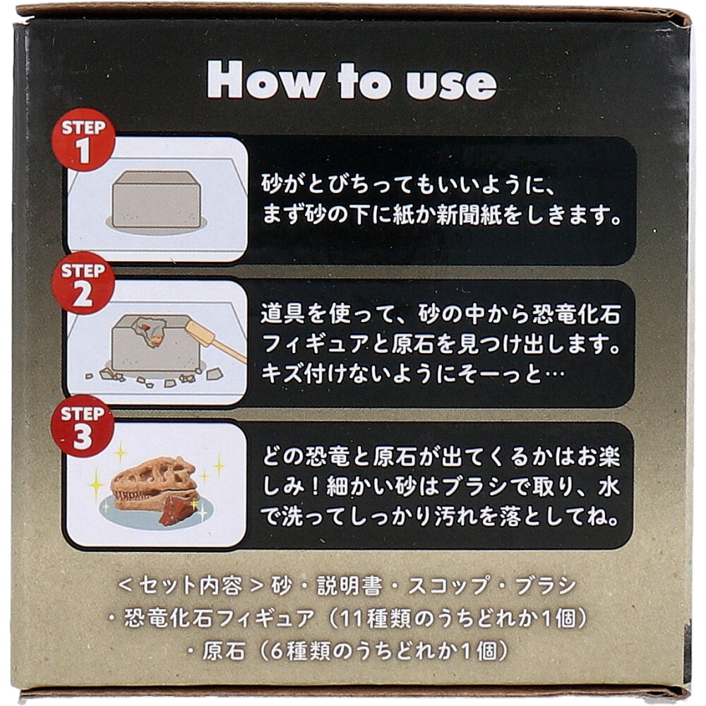 | 素材 | 【セット内容】 砂・説明書・スコップ・ブラシ・恐竜化石フィギュア(11種類のうちどれか1個)・原石(6種類のうちどれか1個) 【対象年齢】 15才以上 ※お子様が使用される場合は、必ず保護者の方がお付き添いください。 【How to use】 (1)砂がとびちってもいいように、まず砂の下に紙か新聞紙をしきます。 (2)道具を使って、砂の中から恐竜化石フィギュアと原石を見つけ出します。キズ付けないようにそーっと・・・。 (3)どの恐竜と原石が出てくるかはお楽しみ!細かい砂はブラシで取り、水で洗ってしっかり汚れを落としてね。 |