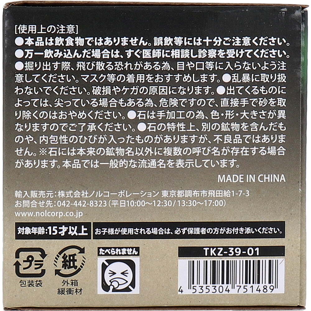 | 注意事項 | 【使用上の注意】 ・本品は飲食物ではありません。誤飲等には十分ご注意ください。 ・万一飲み込んだ場合は、すぐ医師に相談し診察を受けてください。 ・掘り出す際、飛び散る恐れがある為、目や口等に入らないよう注意してください。マスク等の着用をおすすめします。 ・乱暴に取り扱わないでください。破損やケガの原因になります。 ・出てくるものによっては、尖っている場合もある為、危険ですので、直接手で砂を取り除くのはおやめください。 ・石は手加工の為、色・形・大きさが異なりますのでご了承ください。 ・石の特性上、別の鉱物を含んだものや、内包性のひびが入ったものがありますが、不良品ではありません。 ・石には本来の鉱物名以外に複数の呼び名が存在する場合があります。本品では一般的な流通名を表示しています。 |