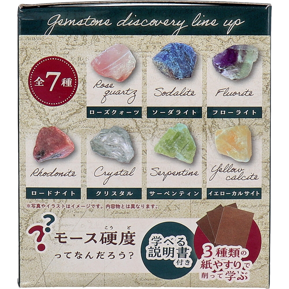 | 素材 | 【セット内容】 砂・説明書・スコップ・ブラシ・紙やすり3枚・原石7種類のうちどれか1個 【対象年齢】 15才以上 ※お子様が使用される場合は、必ず保護者の方がお付き添いください。 【How to use】 (1)砂がとびちってもいいように、まず砂の下に紙か新聞紙をしきます。 (2)道具を使って、砂の中から原石を見つけ出します。キズ付けないようにそーっと・・・。 (3)どの原石が出てくるかはお楽しみ!細かい砂はブラシで取り、水で洗ってしっかり汚れを落としてね。 (4)原石を紙やすりで削ってみよう!コップに入れた水に時々原石をつけ、原石が湿った状態で削ってね。 |