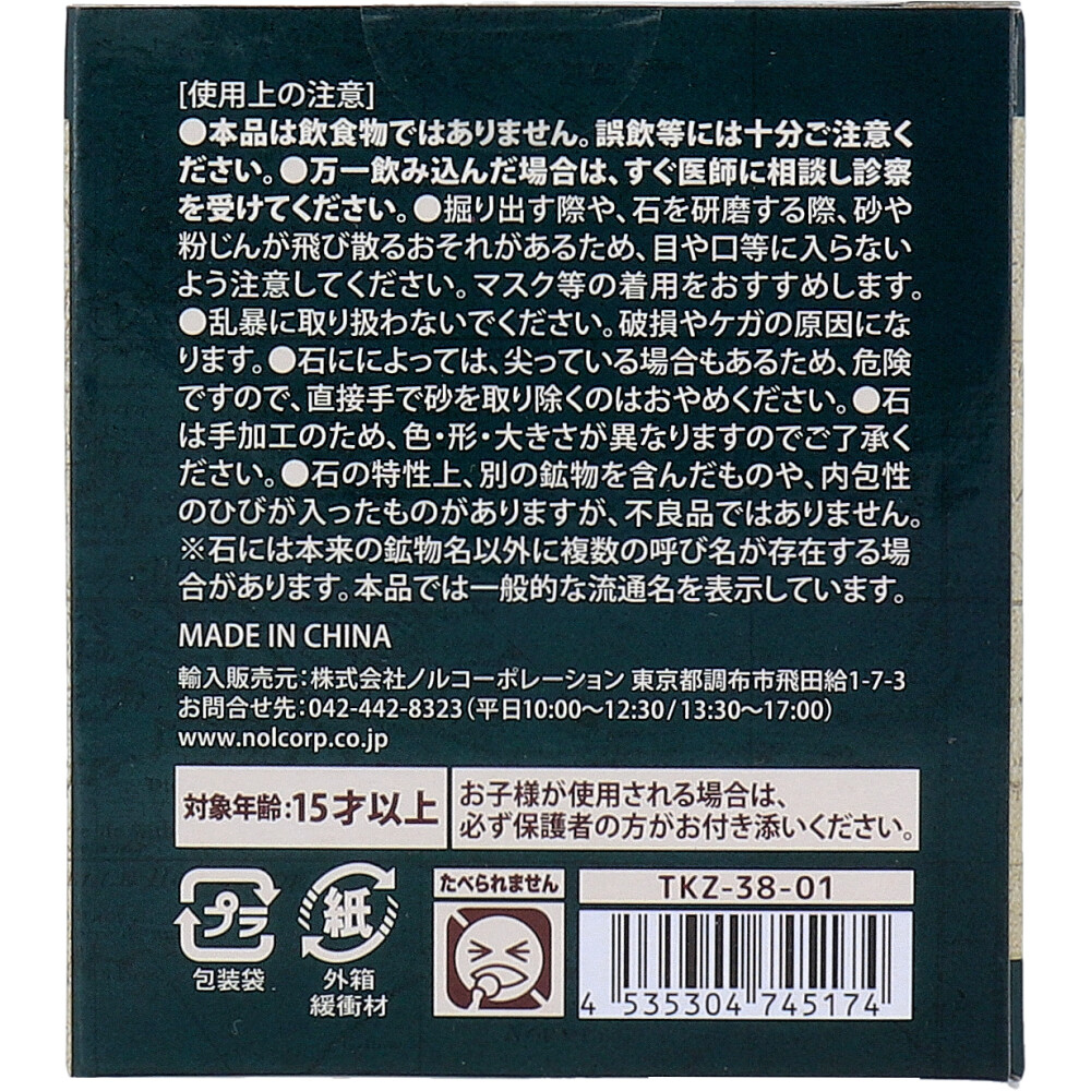 | 注意事項 | 【使用上の注意】 ・本品は飲食物ではありません。誤飲等には十分ご注意ください。 ・万一飲み込んだ場合は、すぐ医師に相談し診察を受けてください。 ・掘り出す際や、石を研磨する際、砂や粉じんが飛び散るおそれがある為、目や口等に入らないよう注意してください。マスク等の着用をおすすめします。 ・乱暴に取り扱わないでください。破損やケガの原因になります。 ・石によっては、尖っている場合もある為、危険ですので、直接手で砂を取り除くのはおやめください。 ・石は手加工のため、色・形・大きさが異なりますのでご了承ください。 ・石の特性上、別の鉱物を含んだものや、内包性のひびが入ったものがありますが、不良品ではありません。 ・石には本来の鉱物名以外に複数の呼び名が存在する場合があります。本品では一般的な流通名を表示しています。 |