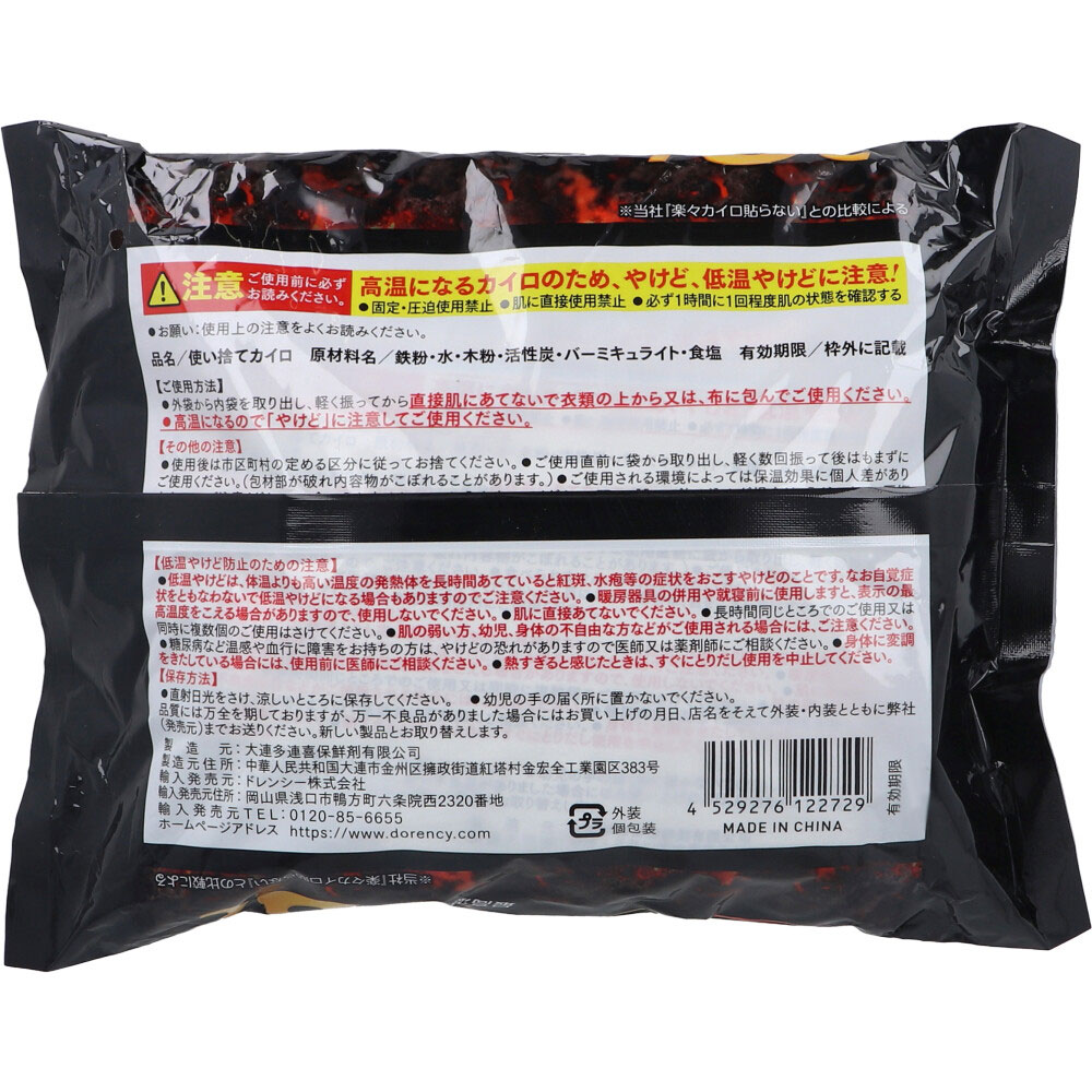 | 注意事項 | 【注意】 ・使い捨てカイロは発熱体です。低温やけど防止のため、使用方法・注意事項を必ずよくお読みの上、使用方法・注意事項を必ず守ってご使用ください。 ★その他の注意 ・使用後は市区町村の定める区分に従ってお捨てください。 ・ご使用直前に袋から取り出し、 軽く数回振って後はもまずにご使用ください。(包材部が破れ内容物がこぼれることがあります。) ・ご使用される環境によっては保温効果に個人差がありますのでご注意ください。 ・食べられません。 ・口に入れないでください。 万一、誤って飲み込んだ場合は、うがいをして医師の診断を受けてください。又、目に入った場合は、目をこすらずにすぐに清水で洗い流し、医師の診断を受けてください。 ・有効期限内にご使用ください。 ★低温やけど防止のための注意 ・低温やけどは、体温よりも高い温度の発熱体を長時間当てていると紅斑、水疱等の症状をおこすやけどのことです。なお自覚症状をともなわないで低温やけどになる場合もありますのでご注意ください。 ・暖房器具の併用や就寝前に使用しますと、表示の最高温度をこえる場合がありますので、使用しないでください。 ・肌に直接あてないでください。 ・長時間同じところでのご使用又は同時に複数個のご使用はさけてください。 ・肌の弱い方、幼児、身体の不自由な方などがご使用される場合には、ご注意ください。 ・糖尿病など温感や血行に障害をお持ちの方は、やけどの恐れがありますので医師又は薬剤師にご相談ください。 ・身体に変調をきたしている場合には、使用前に医師にご相談ください。 ・熱すぎると感じたときは、すぐにとりだし使用を中止してください。 |