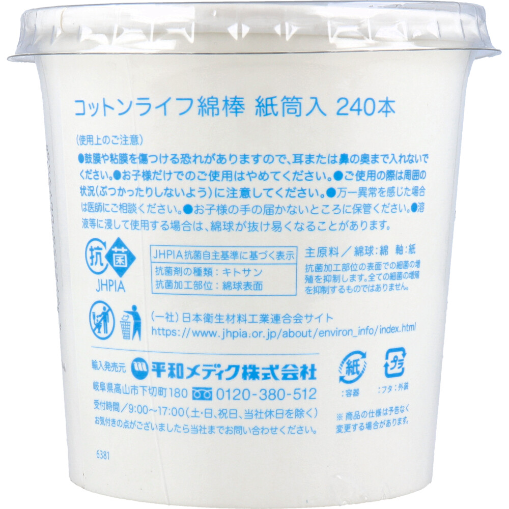 | 素材 | 【主原料表示】 ・綿球:綿 ・軸:紙 【JHPIA抗菌自主基準に基づく表示】 ・抗菌剤の種類:キトサン ・抗菌加工部位:綿球表面 ※抗菌加工部位の表面での細菌の増殖を抑制します。全ての細菌の増殖を抑制するものではありません。 |
