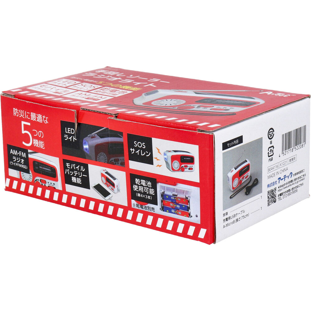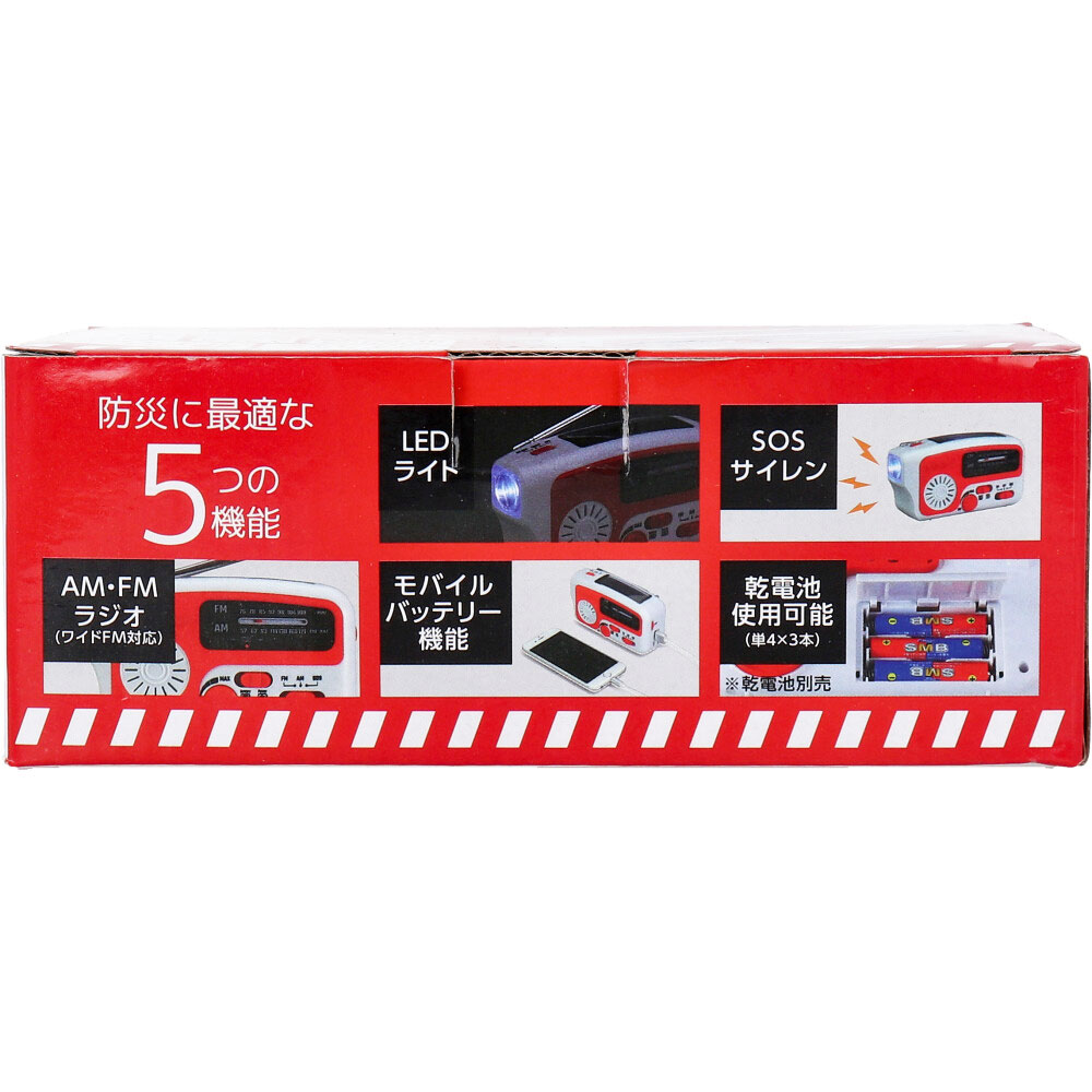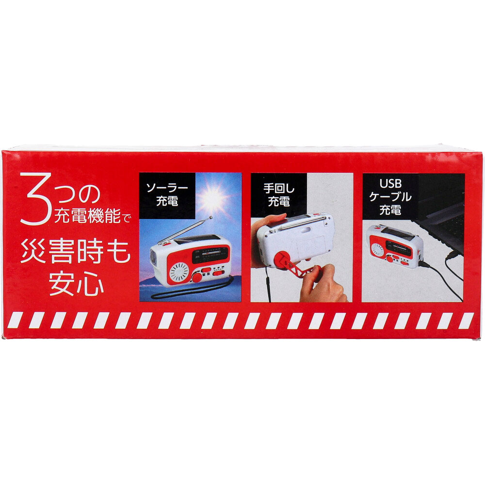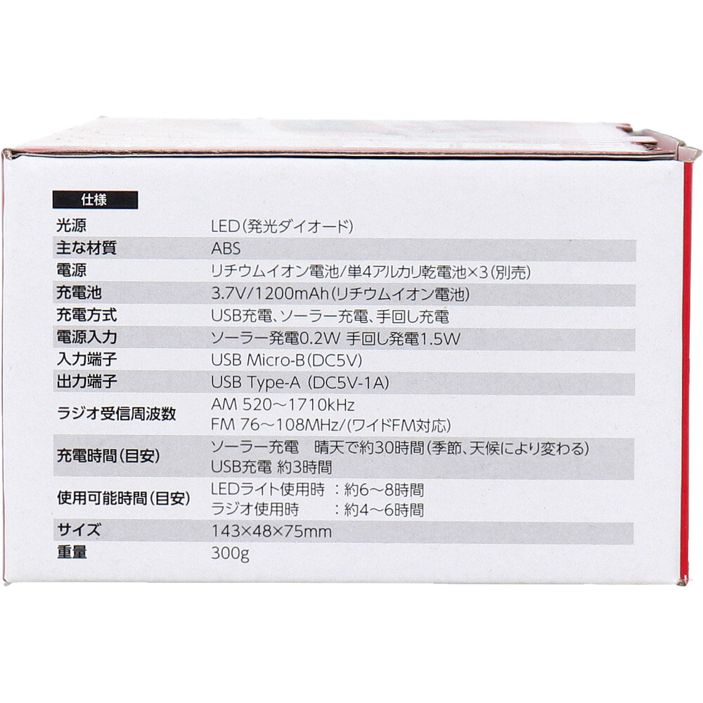 | 素材 | 【セット内容】 ・本体:1 ・充電用USBケーブル A-MicroB(長さ75cm):1 【仕様】 ・光源:LED(発光ダイオード) ・主な材質:ABS ・電源:リチウムイオン電池/単4アルカリ乾電池×3(別売) ・充電池:3.7V/1200mAh(リチウムイオン電池) ・充電方式:USB充電、ソーラー充電、手回し充電 ・電源入力:ソーラー発電0.2W、手回し発電1.5W ・入力端子:USB Micro-B(DC5V) ・出力端子:USB Type-A(DC5V-1A) ・ラジオ受信周波数:AM 520~1710kHz、FM 76~108MHz ・充電時間(目安):ソーラー充電 晴天で約30時間(季節、天候により変わる)、USB充電 約3時間 ・使用可能時間(目安):LEDライト使用時 約6~8時間、ラジオ使用時 約4~6時間 ・サイズ:143×48×75mm ・重量:300g |