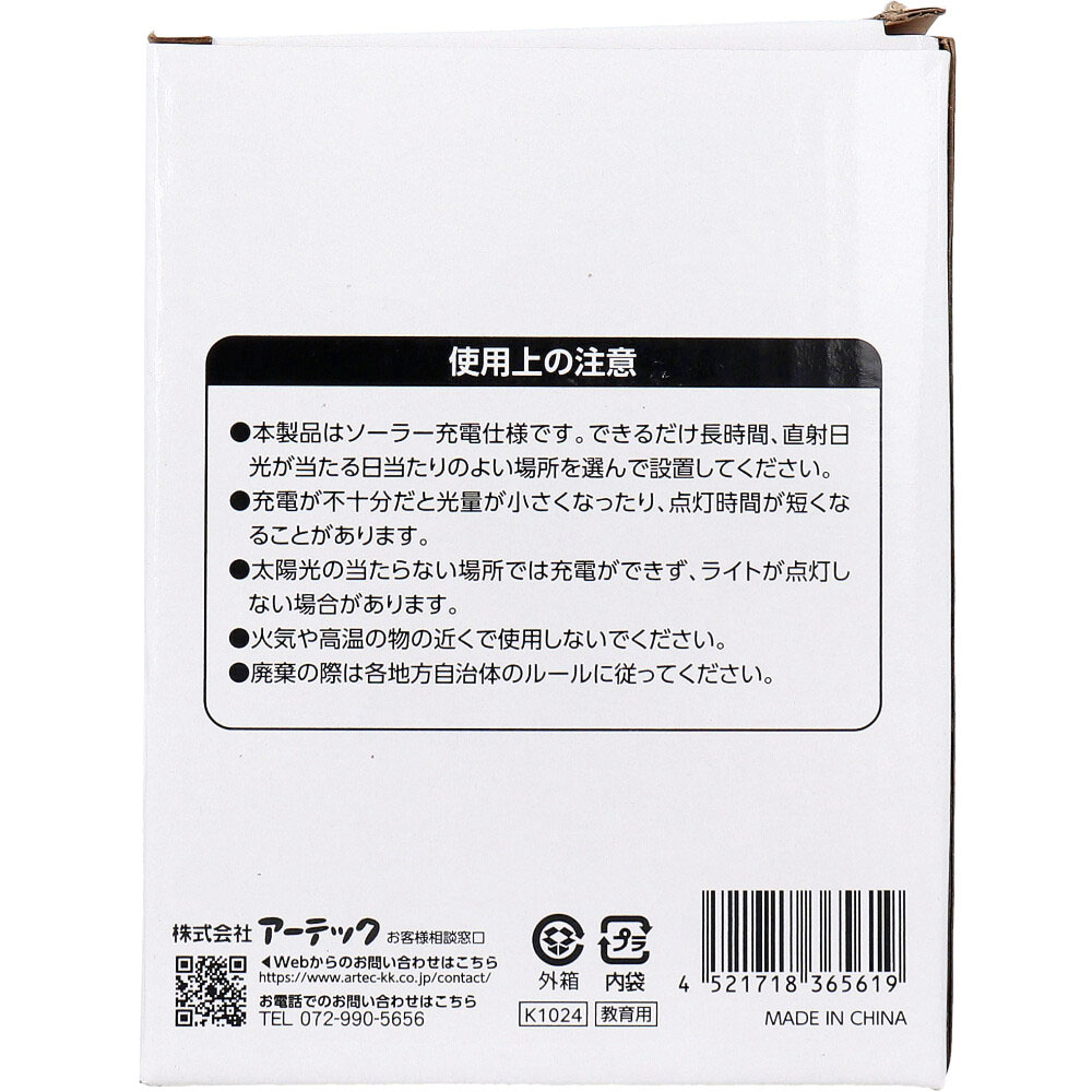 | 注意事項 | 【使用上の注意】 ・本製品はソーラー充電仕様です。できるだけ長時間、直射日光が当たる日当たりのよい場所を選んで設置してください。 ・充電が不十分だと光量が小さくなったり、点灯時間が短くなることがあります。 ・太陽光の当たらない場所では充電ができず、ライトが点灯しない場合があります。 ・火気や高温の物の近くで使用しないでください。 ・廃棄の際は各地方自治体のルールに従ってください。 |