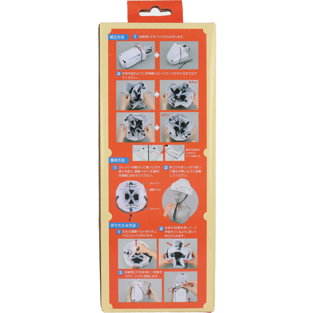 | 注意事項 | 【注意】 ・本製品を使用する前に、本書をよく読み十分ご理解頂いたうえでご使用ください。 ・組み立て時、折り畳み時にヘルメット本体の隙間に指を挟まないように注意してください。 ・6ヵ月に1度はヘルメットの形に組み立てて、外観等を点検してください。 ・合成樹脂・合成繊維部の経年劣化が起こります。経年劣化を抑えるため高温多湿な環境を避け、暗所に保管してください。 ・1度衝撃が加わった製品は性能が著しく低下しますので継続して使用しないでください。 ・本製品は災害時の飛来・落下物から頭部を保護するためのヘルメットです。本来の用途以外での使用はしないでください。 ・箱は大切に保管しておいてください。 |
