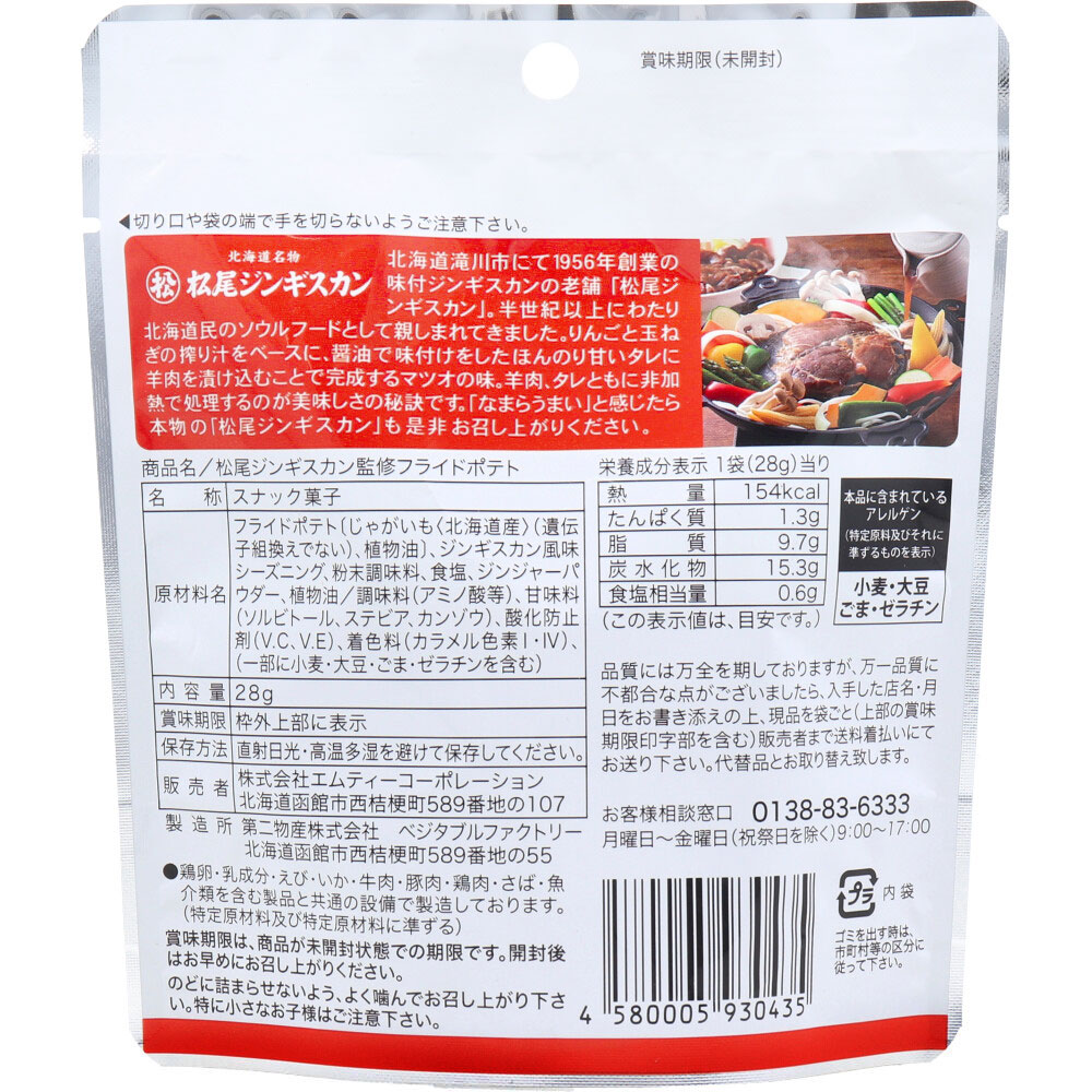 | 素材 | 【名称】 スナック菓子 【原材料名】 フライドポテト(じゃがいも(北海道産)(遺伝子組換えでない)、植物油)、ジンギスカン風味シーズニング、粉末調味料、食塩、ジンジャーパウダー、植物油/調味料(アミノ酸等)、甘味料(ソルビトール、ステビア、カンゾウ)、酸化防止剤(V.C、V.E)、着色料(カラメル色素I・IV)、(一部に小麦・大豆・ごま・ゼラチンを含む) 【栄養成分表示(1袋(28g)あたり)】 熱量:154kcaL たんぱく質:1.3g 脂質:9.7g 炭水化物:15.3g 食塩相当量:0.6g(この表示値は、目安です。) 【保存方法】 ・直射日光、高温多湿を避けて保存してください。 |