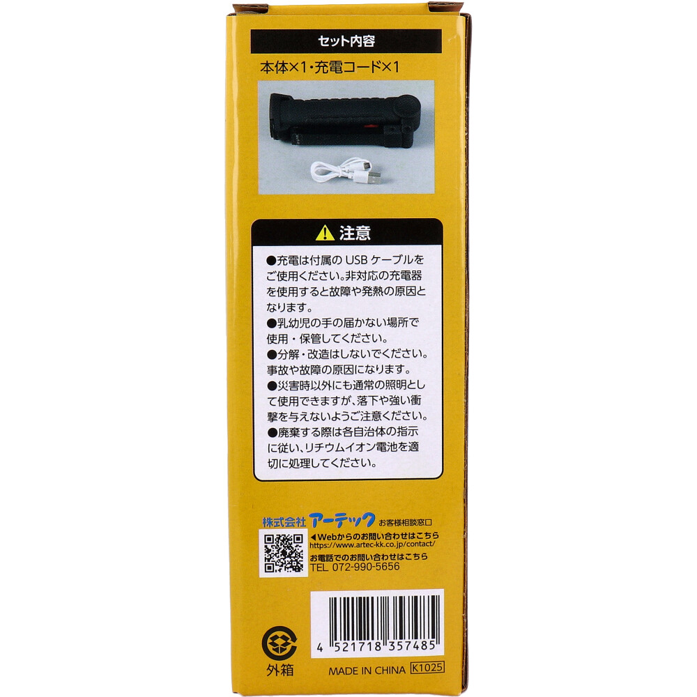 | 注意事項 | 【注意】 ・充電は付属のUSBケーブルをご使用ください。非対応の充電器を使用すると故障や発熱の原因となります。 ・乳幼児の手の届かない場所で使用・保管してください。 ・分解・改造はしないでください。事故や故障の原因になります。 ・災害時以外にも通常の照明として使用できますが、落下や強い衝撃を与えないようご注意ください。 ・廃棄する際は各自治体の指示に従い、リチウムイオン電池を適切に処理してください。 |