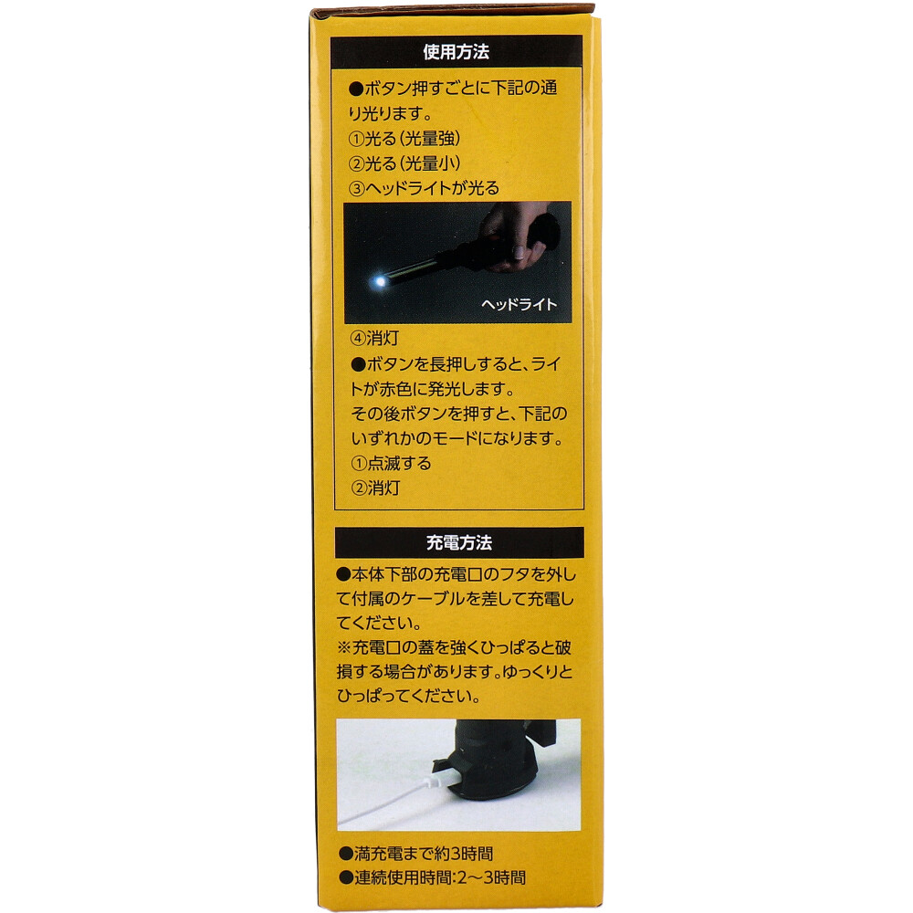 | 素材 | 【サイズ】 折りたたみ時:50×30×145mm、展開時(最大):50×30×253mm 【材質】 ABSなど 【セット内容】 本体×1、充電コード(USB A-Micro B)×1 【使用方法】 ・ボタンを押すごとに下記の通り光ります (1)光る(光量強) (2)光る(光量小) (3)ヘッドライトが光る。 (4)消灯 ・ボタンを長押しすると、ライトが赤色に発光します。その後ボタンを押すと、下記のいずれかのモードになります。 (1)点滅する (2)消灯 【充電方法】 本体下部の充電口のフタを外して付属のケーブルを差して充電してください。 ※充電口の蓋を強くひっぱると破損する場合があります。ゆっくりとひっぱってください。 ・満充電まで約3時間 ・連続使用時間:2~3時間 |