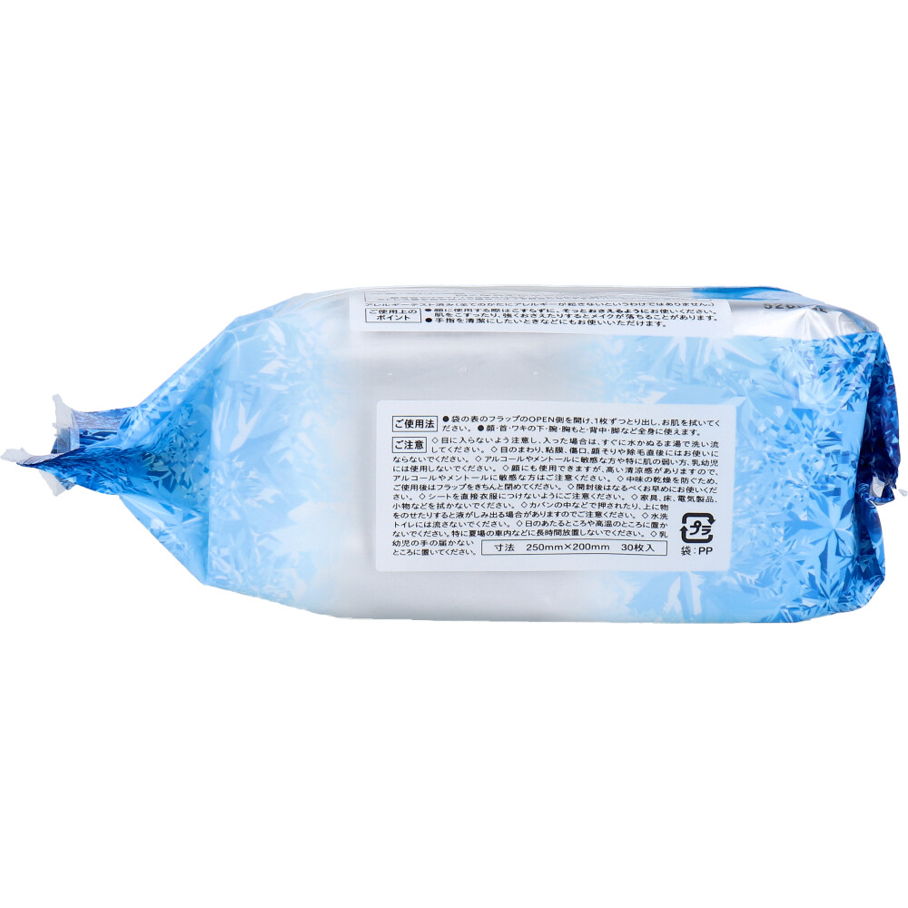 | 注意事項 | 【ご注意】 ・目に入らないよう注意し、入った場合は、すぐに水かぬるま湯で洗い流してください。 ・目のまわり、粘膜、傷口、顔そりや除毛直後にはお使いにならないでください。 ・アルコールやメントールに敏感な方や特に肌の弱い方、乳幼児には使用しないでください。 ・顔にも使用できますが、高い清涼感がありますので、アルコールやメントールに敏感な方はご注意ください。 ・中味の乾燥を防ぐため、ご使用後はフラップをきちんと閉めてください。 ・開封後はなるべくお早めにお使いください。 ・シートを直接衣類につけないようにご注意ください。 ・家具、床、電気製品、小物などを拭かないでください。 ・カバンの中などで押されたり、上に物をのせたりすると液がしみ出る場合がありますのでご注意ください。 ・水洗トイレには流さないでください。 ・日のあたるところや高温のところに置かないでください。 ・特に夏場の車内などに長時間放置しないでください。 ・乳幼児の手の届かないところに置いてください。 ・お肌に異常が生じていないかよく注意して使用してください。 ・傷やはれもの・湿しんなど異常のある部位にはお使いにならないでください。また、赤み・はれ・かゆみ・しげき・色抜け(白斑等)や黒ずみなどの異常があらわれたときは、使用を中止し、皮ふ科医などにご相談ください。続けてお使いになりますと悪化させることがあります。 ・目に入らないよう注意し、入ったときは、すぐに洗い流してください。 |