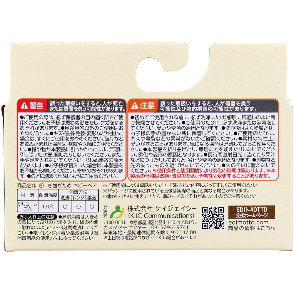 | 素材 | 【名称】 商品名:にぎにぎ歯がため ベビーベア 【対象】 3カ月~ 【材質・耐熱温度】 シリコーンゴム・170度 【消毒方法】 ・煮沸:○ ・レンジ:○ ・薬液:○ |