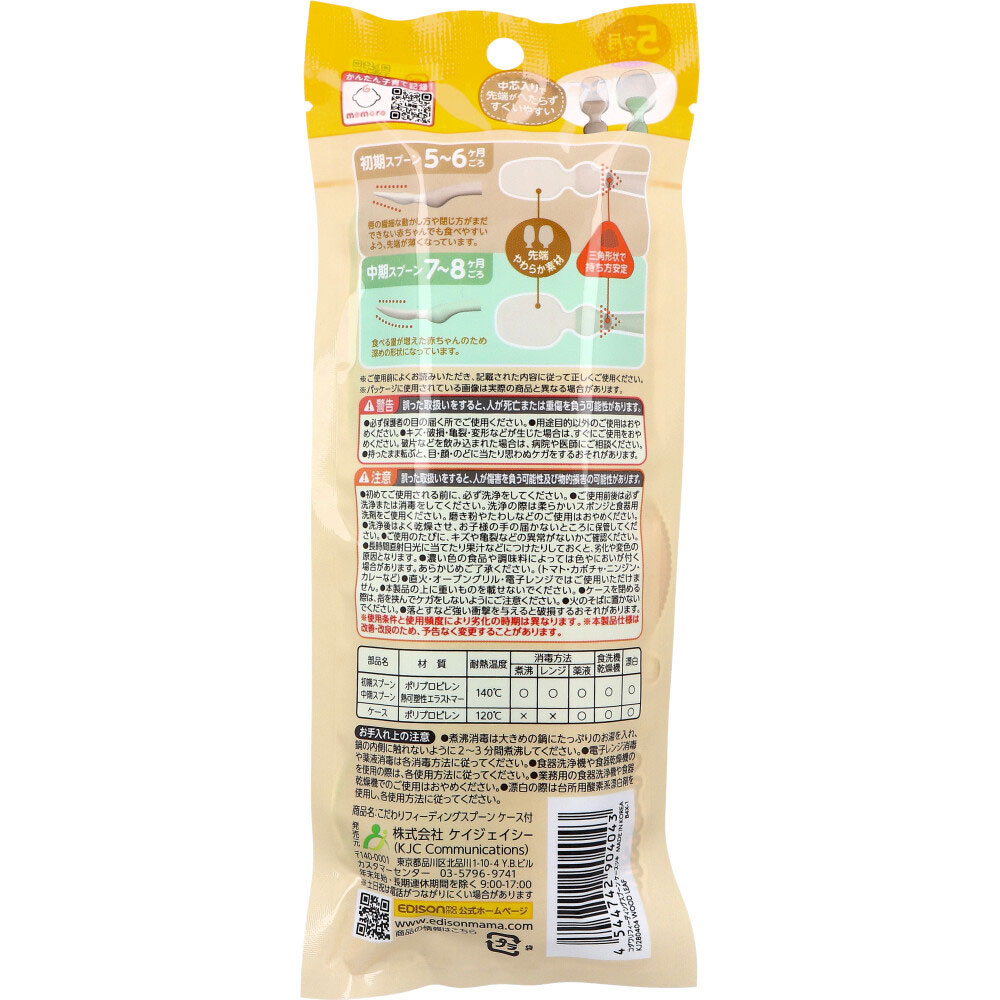 | 素材 | 【材質】 初期スプーン・中期スプーン:ポリプロピレン、熱可塑性エラストマー ケース:ポリプロピレン 【耐熱温度】 初期スプーン・中期スプーン:140度 ケース:120度 【消毒方法】 初期スプーン・中期スプーン:煮沸・レンジ・薬液○ ケース:煮沸・レンジ×、薬液○ 【食洗機乾燥機・漂白】 初期スプーン・中期スプーン:○ ケース:○ 【対象年齢】 ・初期スプーン:5~6ヶ月ごろ。 ・中期スプーン:7~8ヶ月ごろ。 |