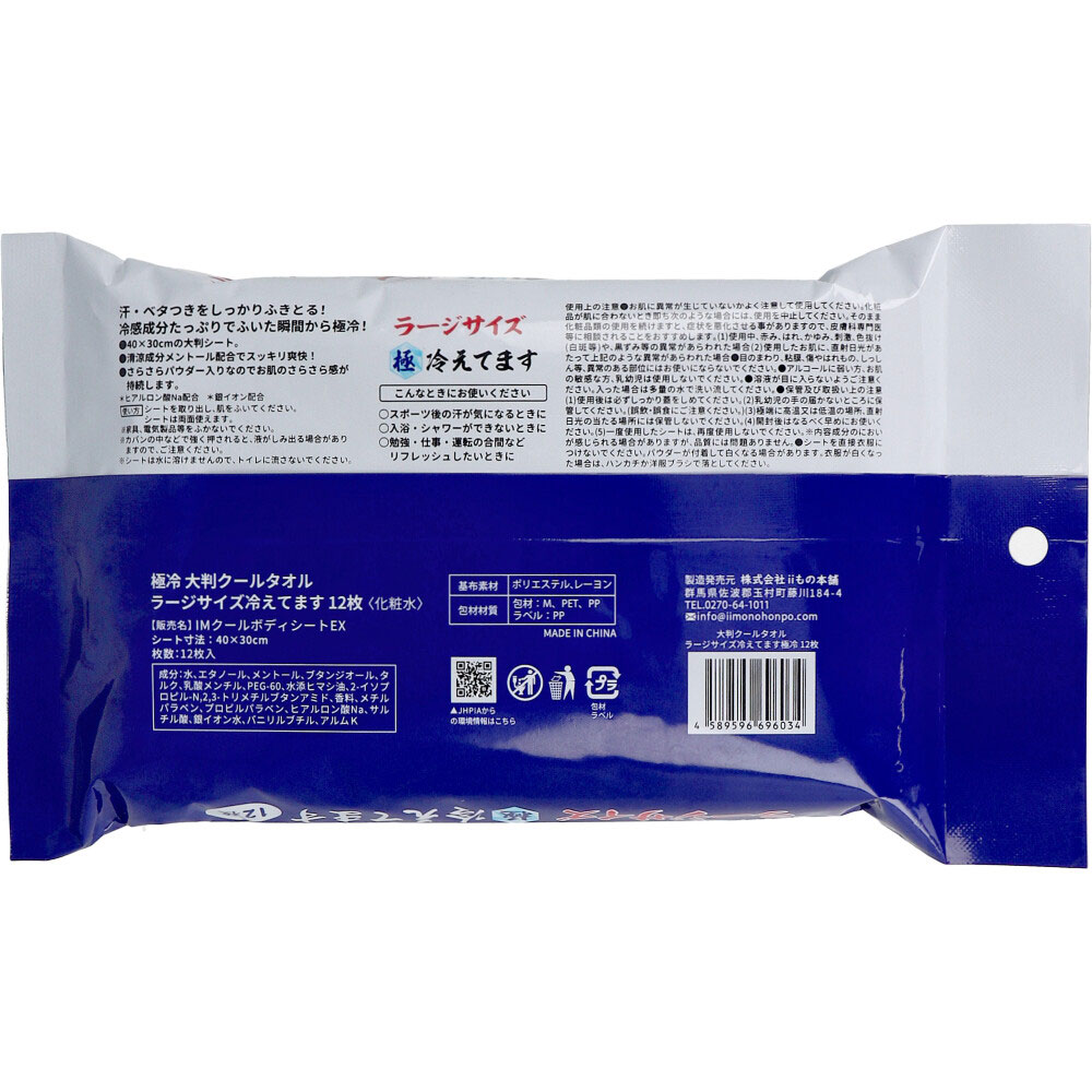 | 素材 | 【化粧品】 販売名:IMクールボディシートEX 【成分】 水、エタノール、メントール、ブタンジオール、タルク、乳酸メンチル、PEG-60、水添ヒマシ油、2-インプロビル-N,2,3-トリメチルフタンアミド、香料、メチルパラベン、プロピルパラベン、ヒアルロン酸Na、サルチル酸、銀イオン水、パニリルプチル、アルムK 【基布素材】 ポリエステル、レーヨン 【シート寸法】 40×30cm 【使い方】 ・シートを取り出し、肌をふいてください。シートは両面使えます。 ※家具、電気製品等をふかないでください。 ※カバンの中などで強く押されると、液がしみ出る場合がありますので、ご注意ください。 ※シートは水に溶けませんので、トイレに流さないでください。 【使用上の注意】 ・お肌に異常が生じていないかよく注意して使用してください。化粧品が肌に合わないとき即ち次のような場合には、使用を中止してください。そのまま化粧品類の使用を続けますと、症状を悪化させる事がありますので、皮膚科専門医等にご相談されることをおすすめします。 (1)使用中、赤み、はれ、かゆみ、刺激、色抜け(白斑等)や、黒ずみ等の異常があらわれた場合。 (2)使用したお肌に、直射日光があたって上記のような異常があらわれた場合。 ・目のまわり、粘膜、傷やはれもの、しっしん等、異常のある部位にはお使いにならないでください。 ・アルコールに弱い方、お肌の敏感な方、乳幼児は使用しないでください。 ・溶液が目に入らないようご注意ください。入った場合は多量の水で洗い流してください。 ★保管及び取扱い上の注意 ・使用後は必ずしっかり蓋をしめてください。 ・乳幼児の手の届かないところに保管してください。(誤飲・誤食にご注意ください。) ・極端に高温又は低温の場所、直射日光の当たる場所には保管しないでください。 ・開封後はなるべく早めにお使いください。 ・一度使用したシートは、再度使用しないでください。 ・内容成分のにおいが感じられる場合がありますが、品質には問題ありません。 ・シートを直接衣服につけないでください。パウダーが付着して白くなる場合があります。衣服が白くなった場合は、ハンカチか洋服ブラシで落としてください。 |