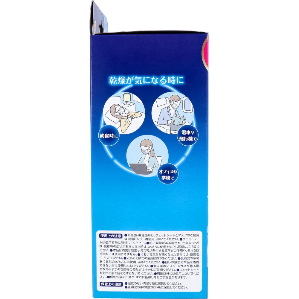 | 注意事項 | 【使用上の注意】 ・衛生面・機能面から、ウェットシートとマスクのご使用は1回限りとし、再使用しないでください。 ・ウェットシートは使用直前に開封してください。 ・肌に異常がある場合や、かゆみ・かぶれ・発疹等の症状があらわれた時は、ただちに使用を中止し医師にご相談ください。 ・本品は有害な粉塵やガス等が発生する場所での使用や、それを防ぐ目的には使用できません。 ・においで気分が悪くなった場合には、使用を中止してください。 ・火気のそばでの使用はおやめください。 ・乳幼児や呼吸器に異常のある方には使用しないでください。 ・自らの意思で本品を着脱できない方は使用しないでください。 ・個人差等により、メガネが曇る場合がありますので運転の際などは十分にご注意ください。 ・ウェットシートを触った手で目をこすらないでください。 ・用途以外には使用しないでください。 ・個別包装の印刷が、まれに色移りをおこす場合があります。 ・就寝時の使用を考慮して、鼻の部分にノーズフィッターは入っておりません。 ・マスクは感染(侵入)を完全に防ぐものではありません。 ★保管上の注意 ・湿気のない清潔な所に保管してください。 ・乳幼児の手の届かない所に保管してください。 |