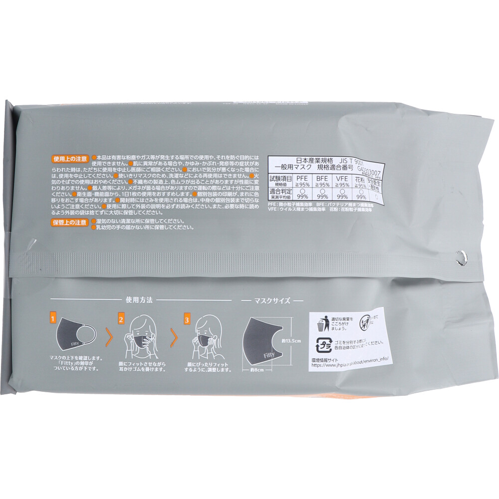 | 素材 | 【品名】 マスク 【マスクサイズ】 ふつうサイズ:約8cm×13.5cm 【素材】 本体・フィルタ部:ポリプロピレン 耳ひも部:ナイロン、ポリエステル、ポリウレタン 【使用方法】 (1)マスクの上下を確認します。「Fitty」の刻印がついている方が下です。 (2)顔にフィットさせながら耳かけゴムを掛けます。 (3)顔にぴったりフィットするように、調整します。 |