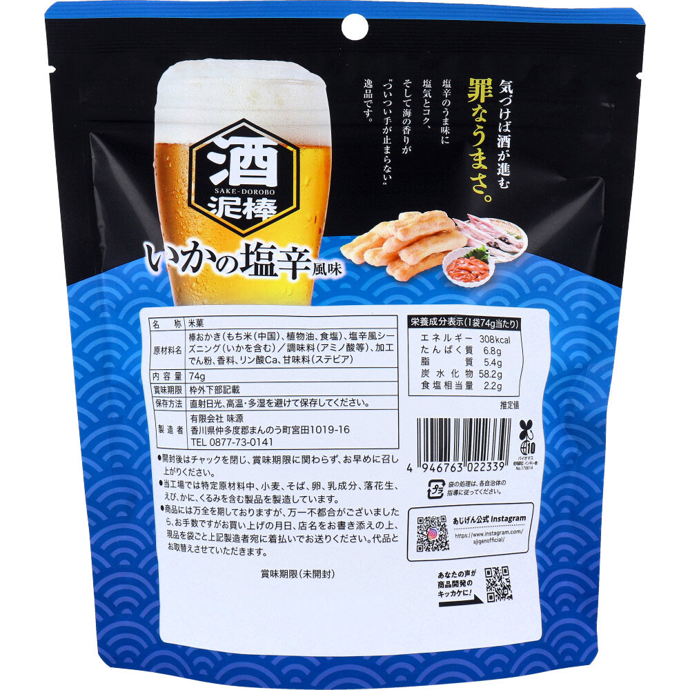 | 素材 | 【名称】 米菓 【原材料名】 棒おかき(もち米(中国)、植物油、食塩)、塩辛風シーズニング(いかを含む)/調味料(アミノ酸等)、加工でん粉、香料、リン酸Ca、甘味料(ステビア) 【栄養成分表示(1袋74g当たり)】 エネルギー:308kcaL たんぱく質:6.8g 脂質:5.4g 炭水化物:58.2g 食塩相当量:2.2g 【保存方法】 ・直射日光、高温・多湿を避けて保存してください。 |