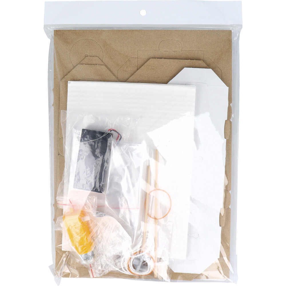 | 素材 | 【セット内容】 片面段ボール・・・2 竹ひご(長・短)・・・各1 接続パーツ・・・1 わゴム・・・2 レース台紙・・・1 糸×1 モーター・・・1 電池ボックス・・・1 テグス・・・1 台紙セット・・・1 【用意するもの】 セロハンテープ、単3電池×3、マーカー、絵の具 |