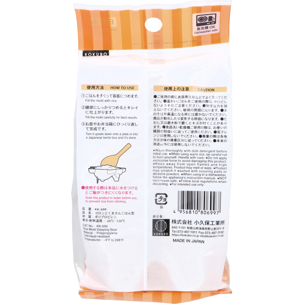 | 素材 | 【品番】 KK-699 【材質】 ポリプロピレン 【耐冷・耐熱温度】 -20度・120度 【使用方法】 (1)ごはんをすくって容器につめます。 (2)細部にしっかりつめるとキレイに仕上がります。 (3)お皿やお弁当箱にひっくり返して完成です。 ※使用する際は本品に水をつけるとごはんがつきにくくなります。 |