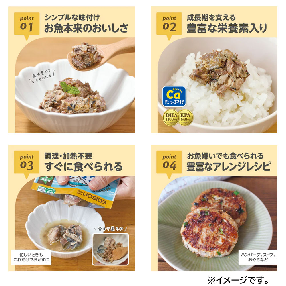 | 注意事項 | 【取扱上の注意】 ・表示している月齢は目安です。お子様の成長に合わせてお召し上がりください。 ・食べている時や食べ終わった後は、湯冷ましなどを飲ませてあげてください。 ・お子様が食べ終わるまで必ずそばで見守ってください。 ・お子様が横になっている時やおんぶされた状態の時は、食べさせないでください。のどに詰まるおそれがあります。 ・開封する際に中身が飛び出すおそれがあります。やけどにご注意ください。 ・離乳の進め方については専門家に相談ください。 ・電子レンジで加熱する際は袋から出して電子レンジ対応容器に移し替えてください。 ・小さい骨が入っています。柔らかく煮ておりますが初めて食べるお子さまや慣れていないお子様が召し上がる際は十分ご注意ください。 ・袋の中に白い固形分ができることがありますが、さんまの脂質、たんぱく質が固まってできたものですので、お召し上がりになられても問題ありません。 ・自動重量選別し充填している為部位にはバラつきがあります。水揚げ時期により魚の味や栄養価が異なることがあります。 ・開封後はお早めにお召し上がりいただき、食べ残しはあげないでください。 ・お子様に上げる前に温度を確かめてからお召し上がりください。 ※パッケージは大切に保管してください。 ・本品製造工場では、小麦・乳成分・ごま・さけ・さば・大豆・鶏肉・豚肉を含む製品を製造しています。 ★保存上の注意 ・お子様の手の届かない所に保存してください。 ・できるだけお早めにお召し上がりください。 ・火のそばに置かないでください。袋が溶けるおそれがあります。 |