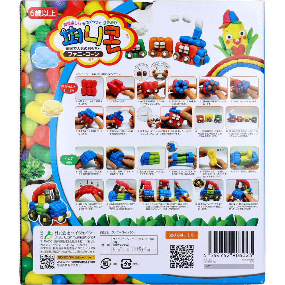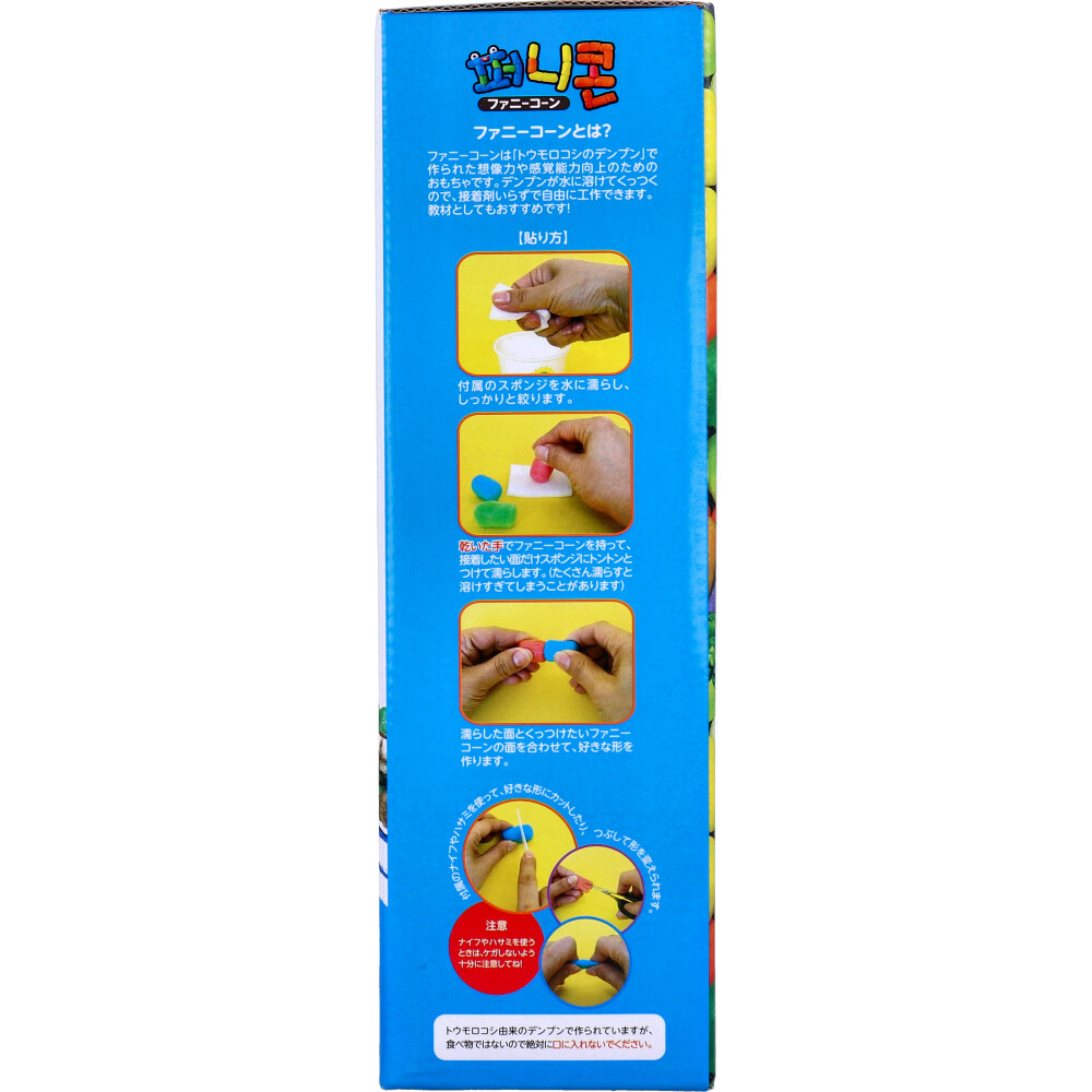 | 素材 | 【貼り方】 ・付属のスポンジを水に濡らし、しっかりと絞ります。 ・乾いた手でファニーコーンを持って、接着したい面だけスポンジにトントンとつけて濡らします。 (たくさん濡らすと溶けすぎてしまうことがあります) ・濡らした面とくっつけたいファニーコーンの面を合わせて、好きな形を作ります。 ・付属のナイフやハサミを使って、k好きな形にカットしたり、つぶして形を変えられます。 ※ナイフやハサミを使うときは、ケガしないよう十分に注意してね! ※トウモロコシ由来のデンプンで作られていますが、食べ物ではないので絶対に口に入れないでください。 【対象】 6歳以上 【材質】 ファニーコーン:コーンスターチ、顔料 ナイフ:ポリエチレン スポンジ:ポリエステル、綿 |