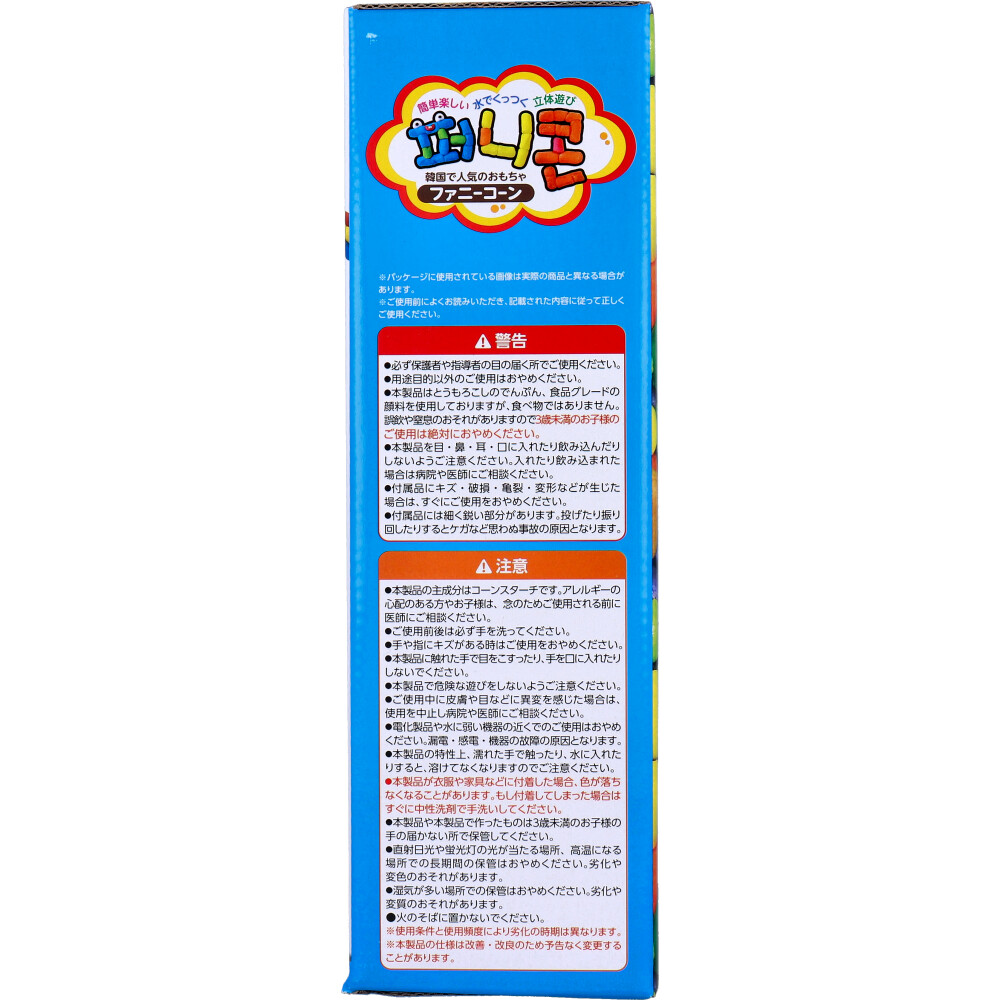 | 注意事項 | 【警告】 ・必ず保護者や指導者の目の届く所でご使用ください。 ・用途目的以外のご使用はおやめください。 ・本製品はとうもろこしのでんぷん、食品グレードの顔料を使用しておりますが、 食べ物ではありません。誤飲や窒息のおそれがありますので3歳未満のお子様のご使用は絶対におやめください。 ・本製品を目・鼻・耳・口に入れたり飲み込んだりしないようご注意ください。入れたり飲み込まれた場合は病院や医師にご相談ください。 ・付属品にキズ・破損・亀裂・変形などが生じた場合は、すぐにご使用をおやめください。 ・付属品には細く鋭い部分があります。投げたり振り回したりするとケガなど思わぬ事故の原因となります。 【注意】 ・本製品の主成分はコーンスターチです。 アレルギーの心配のある方やお子様は、念のためご使用される前に医師にご相談ください。 ・ご使用前後は必ず手を洗ってください。 ・手や指にキズがある時はご使用をおやめください。 ・本製品に触れた手で目をこすったり、手を口に入れたりしないでください。 ・本製品で危険な遊びをしないようご注意ください。 ・ご使用中に皮膚や目などに異変を感じた場合は、使用を中止し病院や医師にご相談ください。 ・電化製品や水に弱い機器の近くでのご使用はおやめください。漏電・感電・機器の故障の原因となります。 ・本製品の特性上、濡れた手で触ったり、水に入れたりすると、溶けてなくなりますのでご注意ください。 ・本製品が衣服や家具などに付着した場合、色が落ちなくなることがあります。もし付着してしまった場合はすぐに中性洗剤で手洗いしてください。 ・本製品や本製品で作ったものは3歳未満のお子様の手の届かない所で保管してください。 ・直射日光や蛍光灯の光が当たる場所、高温になる場所での長期間の保管はおやめください。 劣化や変色のおそれがあります。 ・湿気が多い場所での保管はおやめください。 劣化や変質のおそれがあります。 ・火のそばに置かないでください。 ※使用条件と使用頻度により劣化の時期は異なります。 |