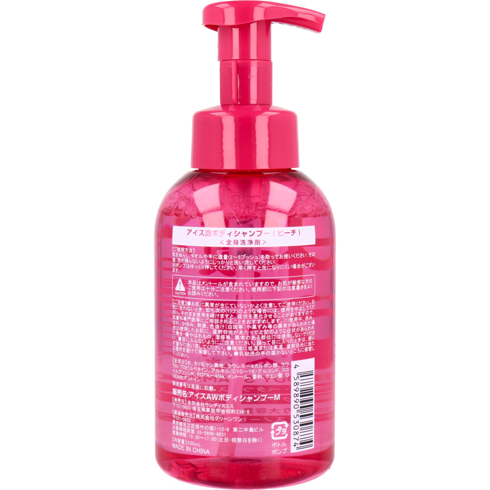| 素材 | 【化粧品】 全身洗浄剤 販売名:アイスAWボディシャンプーM 【全成分】 水、カリ石ケン素地、ラウレス-4カルボン酸、ラウラミドプロピルベタイン、アルキル(C10-16)グルコシド、ココイルグリシンK、EDTA-4Na、メントール、香料、クエン酸、DMDMヒダントイン 【ご使用方法】 肌をぬらし、タオルや手に適量(2~5プッシュ)を取ってお使いください。その後、泡が残らないようにしっかりと洗い流してください。 ※ポンプはゆっくり押してください。早く押すと泡になりにくい場合がございます。 ※本品はメントールが含まれていますので、お肌が敏感な方のご使用は十分ご注意ください。使用前に下記の注意書きをよくお読みください。 |