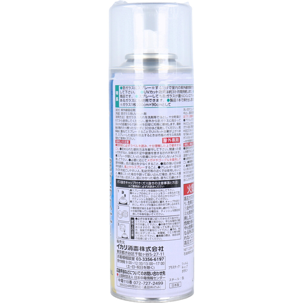 | 素材 | 【成分】 紫外線吸収剤 【用途】 窓ガラス用 UVカット剤 【使用方法】 ・窓ガラスの汚れを洗剤等で落とし、十分乾燥させてから使用してください。 ・屋外から窓ガラスに向かって30cmの距離から15秒/平方メートルを目安に均等に噴射します。 ・噴射後は触れたり擦ったりせずに30分ほど風乾してください。 ・乾燥後に重ねてスプレーすることでUVカット効果が上がります。 ・スプレーした成分を除去するときは市販のガラス用洗剤等をご使用ください。 |