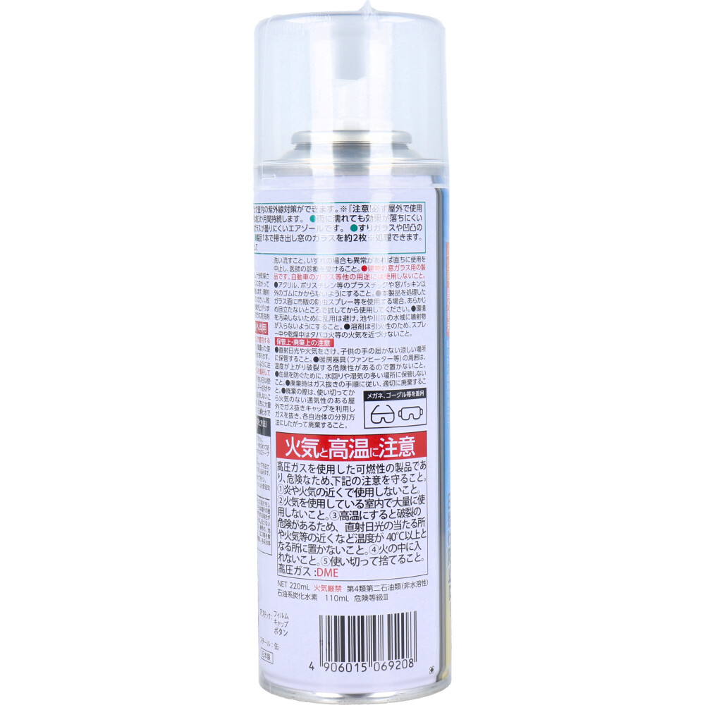 | 注意事項 | 【使用上の注意】 ★屋外専用 ・使用前に必ずラベルを読み、十分に理解した上で使用すること。 ・定められた使用方法を厳守してください。間違った使い方をすると、効力の不足や健康を害する恐れがあります。 ・スプレーが眼に入ったり皮膚にかかったりしないように注意して下さい。 ・必要に応じてメガネやゴーグルを着用して眼を保護し、肌の露出を少なくすること。 ・風の強い日は使用を避け、風上からスプレーすること。 ・アレルギー症状やかぶれを起こしやすい人、 乳幼児等の近くでは使用しないこと。 ・眼に入った場合や誤って吸い込んだ場合、直ちに大量の水で洗い流すこと。いずれの場合も異常があれば直ちに使用を中止し、医師の診察を受けること。 ・建物の窓ガラス用の製品です。自動車のガラス等他の用途には使用しないこと。 ・アクリル、ポリスチレン等のプラスチックや窓パッキン以外のゴムにかからないようにすること。 ・本製品を処理したガラス面に市販の防虫スプレー等を使用する場合、あらかじめ目立たないところで試してから使用してください。 ・環境を汚染しないために乱用は避け、池や川等の水域に噴射物が入らないようにすること。 ・溶剤は引火性のため、スプレー中や乾燥中はタバコ火等の火気を近づけないこと。 ★保管上・廃棄上の注意 ・直射日光や火気をさけ、子供の手の届かない涼しい場所に保管すること。 ・暖房器具(ファンヒーター等)の周囲は、温度が上がり破裂する危険性があるので置かないこと。 ・缶錆を防ぐために、水回りや湿気の多い場所に保管しないこと。 ・廃棄時はガス抜きの手順に従い、適切に廃棄すること。 ・廃棄の際は、使い切ってから火気のない通気性のある屋外でガス抜きキャップを利用しでガスを抜き、各自治体の分別方法にしたがって廃棄すること。 |