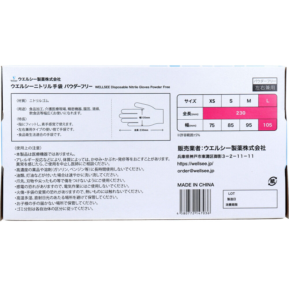 【業務用】ウエルシーニトリルグローブ パウダーフリー ブルー 左右兼用 L 100枚入