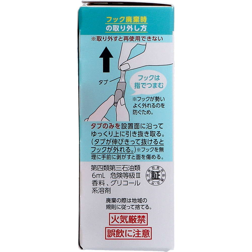 | 注意事項 | 【使用上の注意】 ・本品は飲めない。 ・幼児の手の届く場所に置かない。 ・火気の近くで保管及び使用しない。 ・倒したり、天井に貼るなど極端に傾けた状態で使用しない。 ・便器のフタ裏等の便器内に落ちる可能性がある場所に設置しない。 ・液体をこぼした場合はすぐに拭き取る。(塗装面やプラスチックがシミになったり、変色、変形したりする場合がある。) ・製品正面側を壁や家具等から5cm以上離して使用する。 ・10度以下の場所では、フックの粘着面をドライヤーなどで温めてから貼る。 ・フックを取り外した際、まれに貼った面に変色やシミ跡が残る場合がある。 ・フックを剥がす時はゆっくり剥がす。無理に強く剥がすとフックや貼った面が破損する可能性がある。 ・粘着力が低下するため剥がしたフックは再使用できない。 ・用途以外に使用しない。 ・仕様上少量の液が残るため、液が減って香りが弱くなったらつけかえる。 ※火気厳禁 ※誤飲に注意 |