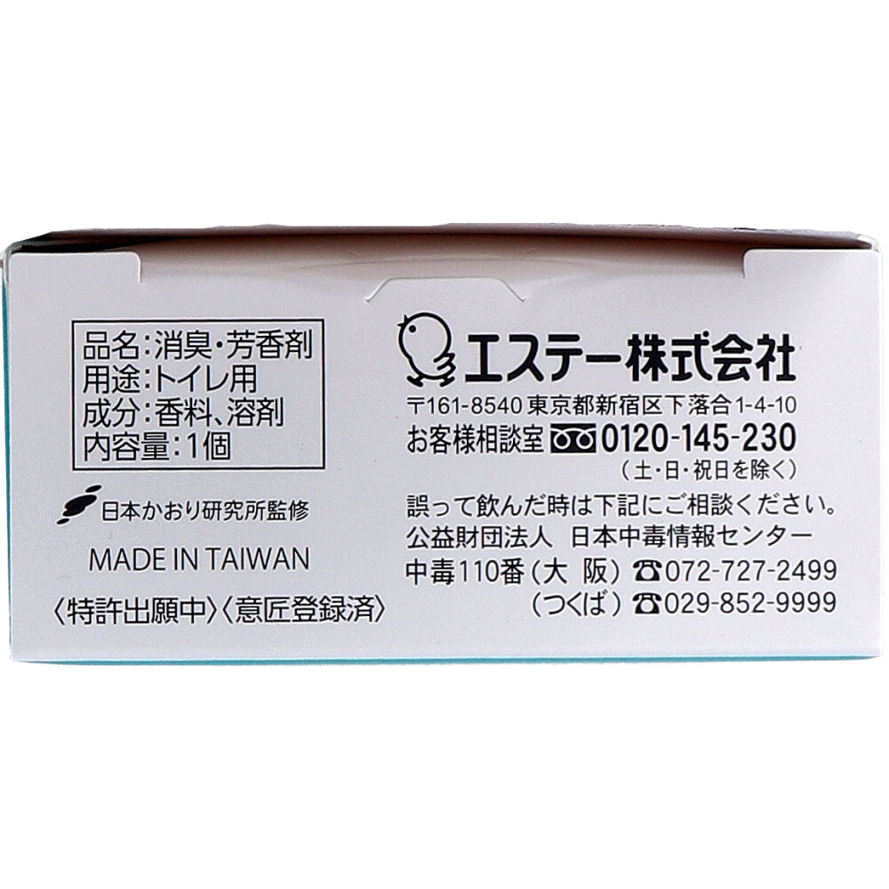 | 素材 | 【品名】 消臭・芳香剤 【用途】 トイレ用 【成分】 香料、溶剤 【使用方法】 (1)容器を開き、カプセルを取り出す。 (2)液体カプセル裏面の透明フィルムのみを、開封口からゆっくり全て剥がす。 ※白いシートは取り出さない。 (3)液体カプセルの開封口を上向きにして容器をセットする。 (4)置いて使う場合:開閉部分を必ず上向きにして置く。 ★便器や壁に取り付ける場合の使用方法 ※フックを剥がすと再使用できない。 (1)設置面の汚れや見えない埃、水分を乾いた布で必ず拭いて完全に乾かす、 ※使用時に容器正面から5cm以上空間を確保できる箇所を選ぶ。 (2)フック背面のタブから剥離フィルムを剥がす。 ※タブは剥がさずフィルムのみ剥がす。 (3)タブを上向きにして設置面に5秒以上強く押し付ける。 (4)容器下部をフックに引っ掛ける。 ・フックの貼り付けができない箇所:ビニル製以外の壁紙、撥水・防汚加工等の特殊加工した壁紙、壁紙の継ぎ目や浮き・汚れ・穴の開いている箇所、土壁、漆喰壁、シリコン面、曲面、凹凸のある面、ザラザラした面 【応急処置】 ・万一、液体が目に入った場合はすぐに流水で充分に洗う。 ・皮フについた場合は石けんで充分に洗う。 ・誤って飲んだ場合は、吐かせずすぐに口をすすぎ、コップ1~2杯程度の水を飲ませる。 ・いずれも異常のある時は医師に相談する。 |