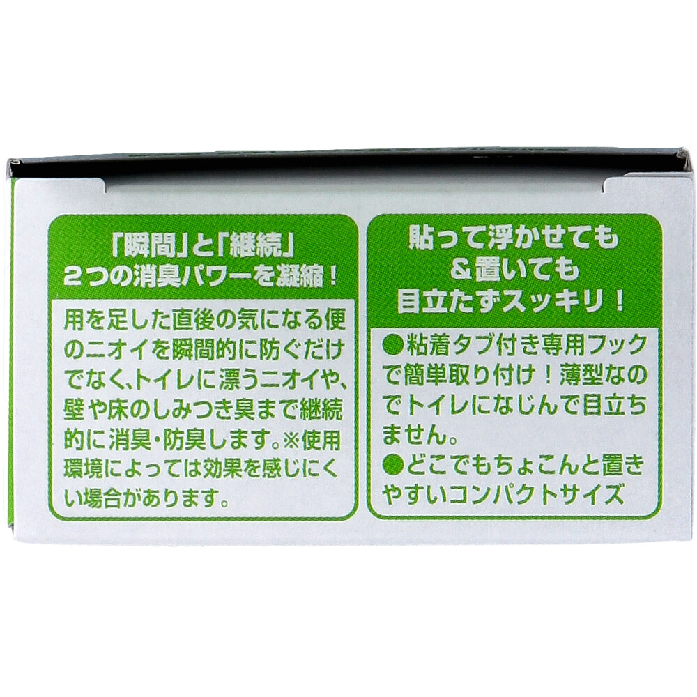 用を足した直後の気になる便のニオイを瞬間的に防ぐだけでなく、トイレに漂うニオイや、壁や床のしみつき臭まで継続的に消臭・防臭します。
