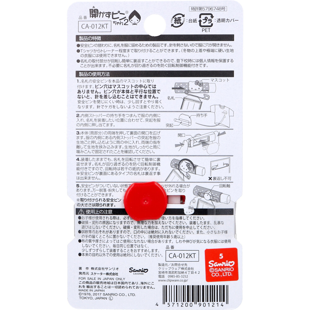 | 素材 | 【品番】 CA-012KT 【使用方法】 (1)名札の安全ピンを本品のマスコットに取り付けます。ピン穴はマスコットの中心ではありません。ピン穴が本体と平行な位置でないと、針を差し込むことはできません。安全ピンを閉じにくい時は、少し回すとやり易くなります。針でケガをしないようご注意ください。 (2)内側ストッパーの持ち手をつまんで服の内側に入れ、名札を装着したい位置に合わせて、突起を服の内側に押し当てます。 (3)本体(筒部分)の両端を押して裏面の開口を広げます。服の内側にある内側ストッパーの突起を服の生地ごと押し込むように筒の中に入れ、両端の指を離して生地を挟み込みます。生地がしっかりと筒に噛みこんで固定されたことを確認してください。 (4)装着したままでも、名札を回転させて簡単に裏返せます。名札が回り過ぎるのを防ぐ回転制御機能付きですので、回転時は若干の抵抗があります。 ※安全ピンが裏面にあるタイプの名札は裏返す事は出来ません。 (5)安全ピンがついていない状態ではマスコットパーツが外れる場合があります。万一脱落・紛失しても回転軸を利用して安全ピンを取り付けることができます。 ※取り付けられる安全ピンの大きさは限られます。 【安全ピンの取り付け方】 ・ピン穴と本体が平行になる位置で安全ピンを差し込んでください。 ※ピン穴の位置はマスコットの中心ではありません。 ※安全ピンが付いていない状態ではマスコットパーツが外れる場合があります。 |