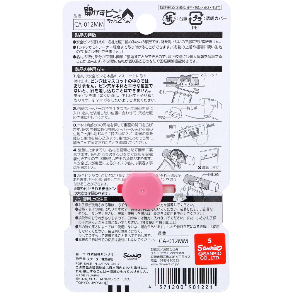 | 素材 | 【品番】 CA-012MM 【使用方法】 (1)名札の安全ピンを本品のマスコットに取り付けます。ピン穴はマスコットの中心ではありません。ピン穴が本体と平行な位置でないと、針を差し込むことはできません。安全ピンを閉じにくい時は、少し回すとやり易くなります。針でケガをしないようご注意ください。 (2)内側ストッパーの持ち手をつまんで服の内側に入れ、名札を装着したい位置に合わせて、突起を服の内側に押し当てます。 (3)本体(筒部分)の両端を押して裏面の開口を広げます。服の内側にある内側ストッパーの突起を服の生地ごと押し込むように筒の中に入れ、両端の指を離して生地を挟み込みます。生地がしっかりと筒に噛みこんで固定されたことを確認してください。 (4)装着したままでも、名札を回転させて簡単に裏返せます。名札が回り過ぎるのを防ぐ回転制御機能付きですので、回転時は若干の抵抗があります。 ※安全ピンが裏面にあるタイプの名札は裏返す事は出来ません。 (5)安全ピンがついていない状態ではマスコットパーツが外れる場合があります。万一脱落・紛失しても回転軸を利用して安全ピンを取り付けることができます。 ※取り付けられる安全ピンの大きさは限られます。 【安全ピンの取り付け方】 ・ピン穴と本体が平行になる位置で安全ピンを差し込んでください。 ※ピン穴の位置はマスコットの中心ではありません。 ※安全ピンが付いていない状態ではマスコットパーツが外れる場合があります。 |