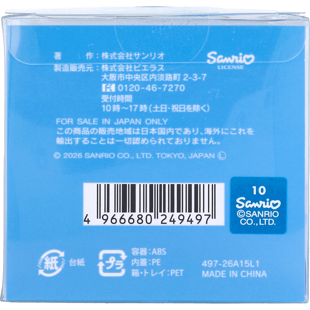 | 素材 | 【化粧品】 販売名:サンリオハンドクリーム25 CN 【成分】 水、ミネラルオイル、セテアリルアルコール、グリセリン、セラミドNP、加水分解コラーゲン、シア脂、マンダリンオレンジ果皮エキス、ヒアルロン酸Na、加水分解ヒアルロン酸Na、アセチルヒアルロン酸Na、ヒアルロン酸クロスポリマーNa、アボカド油、オリーブ果実油、アロエベラ葉水、酢酸トコフェロール、エチルヘキシルグリセリン、(ラウリン酸/ミスチリン酸/パルミチン酸/ステアリン酸)グリセリズ、ジメチコン、セテアレス-25、ステアリン酸グリセリル、ポリオクタニウム-22、フェノキシエタノール、カルボマー、ヒドロキシアセトフェノン、(C13-16)イソアルカン、クロルフェネシン、1,2-ヘキサンジオール、BG、ラウレス-25、キサンタンガム、(アクリル酸/MA)コポリマーNa、香料 |