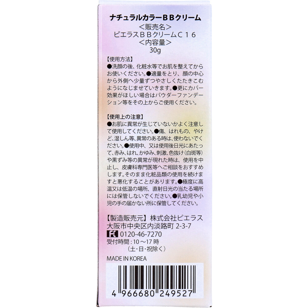 | 素材 | 【化粧品】 販売名:ピエラスBBクリームC16 【成分】 水、PG、シクロペンタシロキサン、酸化チタン、メトキシケイヒ酸エチルヘキシル、イソノナン酸イソノニル、セチルPEG/PPG-10/1ジメチコン、ブドウ種子油、BG、酸化亜鉛、トリ(カプリル酸/カプリン酸)グリセリル、マカデミア種子油、マイクロクリスタリンワックス、シア脂、オリーブ油脂肪酸ソルビタン、カタツムリ分泌液、ミツロウ、オリーブ果実油、マグワ根皮エキス、カンゾウ根エキス、ツボクサエキス、スベリヒユエキス、ヒアルロン酸Na、スクワラン、酢酸トコフェロール、セスキオレイン酸ソルビタン、ジメチコン、硫酸Mg、塩化Na、EDTA-2Na、アラントイン、パンテノール、アルブチン、アデノシン、酸化鉄、メチルパラベン、プロピルパラベン、香料 |
