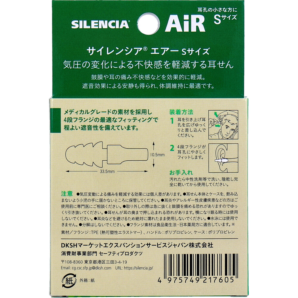| 注意事項 | 【注意】 ・気圧変動による痛みを軽減する効果には個人差があります。 ・耳せん本体とケースを、飲み込まないよう小児の手に届かないところに保管してください。 ・耳炎やアレルギー性皮膚疾患などの方はご使用前に専門医にご相談ください。 ・取り外しの際は急に抜くと鼓膜を痛める恐れがありますのでゆっくり引き抜いてください。 ・耳せんが耳の奥まで押し込まれる恐れがあります。横になり眠る時には使用しないでください。 ・耳炎などを避けるため絶対に濡れたまま使用しないでください。 ・水泳には使用できません。 ・分解はしないでください。 |