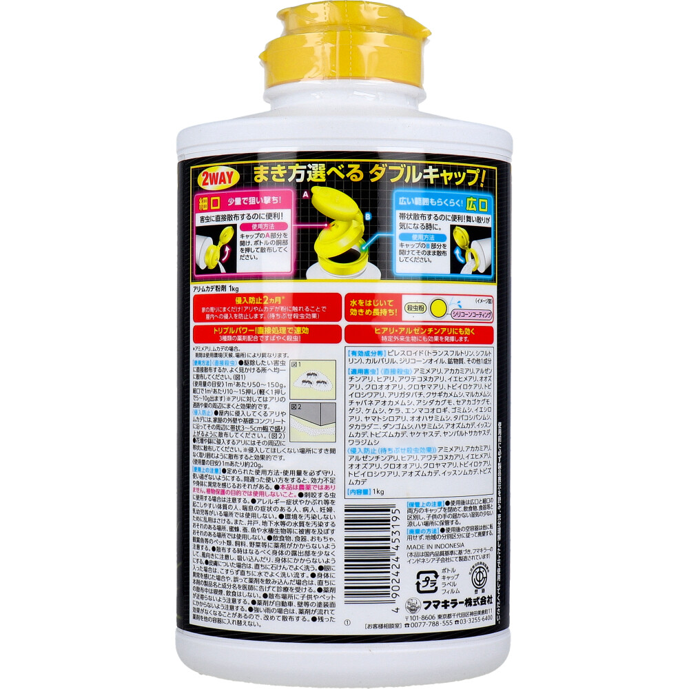 | 素材 | 【有効成分等】 ピレスロイド(トランスフルトリン、シフルトリン)、カルバリル、シリコーンオイル、鉱物質、その他1成分。 【使用方法】 <直接殺虫> ・駆除したい害虫に直接散布するか、よく見かける所へ均一に散布してください。 使用量の目安:1平方メートルあたり50~150g。細口で1平方メートルあたり10~15押し(軽く1押しで5~10g出ます)。 ※アリに対してはアリの通路や巣の周辺にまくと効果的です。 <侵入防止> ・屋内に侵入してくるアリやムカデには、家屋の外壁や基礎コンクリートに沿ってその周辺に帯状3~5cm幅で盛り上がるように散布してください。 ・花壇や鉢に侵入するアリにはその周辺に帯状に散布してください。 ※侵入してほしくない場所にすき間なく取り囲むように散布すると効果的です。 使用量の目安:1メートルあたり20g。 【廃棄の方法】 ・使用後の空容器は他に転用せず、地域の分別区分に従って廃棄する。 |