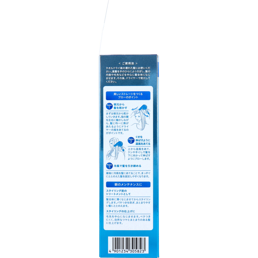 ・ タオルドライ後の濡れた髪にお使いください。適量を手のひらによくのばし、髪の内側や毛先などを中心に髪全体になじませます。その後、ドライヤーで乾かしてください。