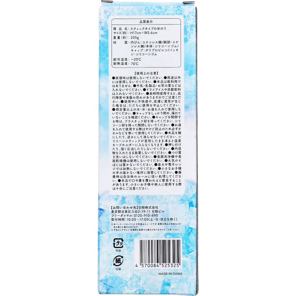 | 素材 | 【商品名】 スティックタイプ氷のう 【材質】 内びん:ステンレス鋼 胴部:ステンレス鋼 本体:シリコーンゴム キャップ:ポリプロピレン パッキン:シリコーンゴム 【サイズ】 約H17cm×W5.6cm 重量:約205g 【耐冷・耐熱温度】 -20度・70度 【使い方】 ★氷のうとして使う ・しっかり凍らせたい場合 (1)シリコーンスティックに水位ラインまで水を入れ、しっかりキャップを閉める。 (2)そのまま冷凍庫で凍らせる。 ※横にしたり、逆さにして凍らせないでください。シリコーンスティックが変形したまま凍ると温度キープホルダーに入らなくなります。 ・すぐに使いたい場合 (1)シリコーンスティックに水と氷を入れ、しっかりキャップを閉める。 ※氷は小さく砕いて入れてください。 ★湯たんぽとして使う (1)シリコーンスティックに70度以下のお湯を入れ、しっかりキャップを閉める。 ※使用時はやけど防止のためタオルなどを巻いてください。 ※熱くなるのでシリコーン部は持たないでください。 |