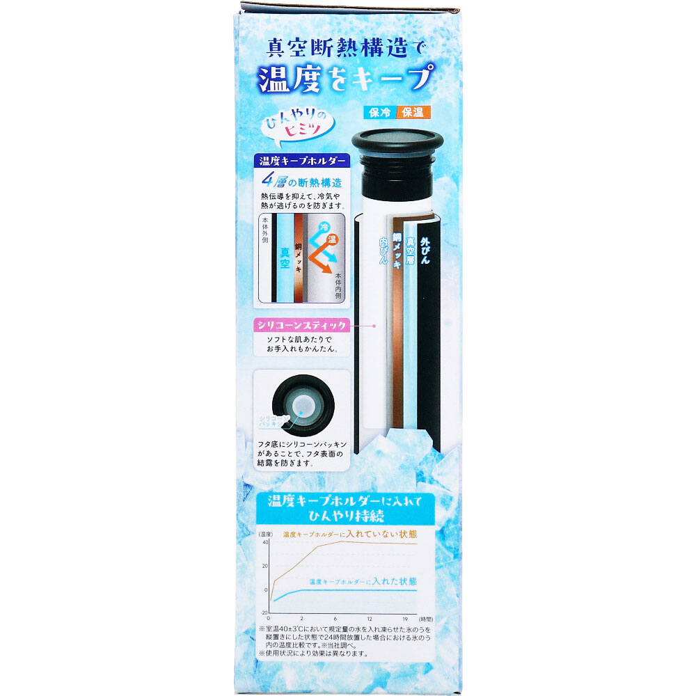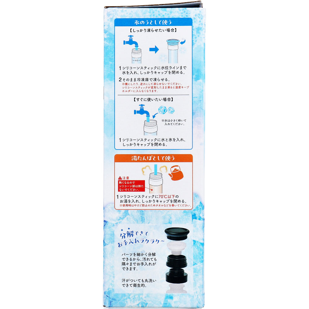 | 注意事項 | 【使用上の注意】 ・就寝時は使用しないでください。 ・用途以外には使用しないでください。 ・本品は飲料用ではありません。 ・牛乳・乳製品・お茶の葉などは入れないでください。 ・ドライアイスや炭酸飲料は入れないでください。 ・長時間使用すると、血行障害や凍傷の恐れがありますのでご注意ください。 ・使用中に不快感や、皮膚に異常が生じた場合は、ただちに使用を中止してください。 ・規定量以上の水・氷・お湯を入れて使用しないでください。 ・キャップをしっかり閉め、漏れていないことを確認ください。 ・キャップを開閉する時は、プラスチック部を持ってください。シリコーン部を持って開閉しないでください。 ・お湯を入れて使用する際はやけど防止のため必ずタオルなどを巻いて使用してください。 ・本品を横にしたり、逆さにして凍らせないでください。シリコーンスティックが変形したまま凍ると温度キープホルダーに入らなくなります。 ・押し付けたり、強く圧迫したりしないでください。 ・内容物を入れたまま放置しないでください。 ・つけ置き洗いはしないでください。 ・食器洗浄機や食器乾燥機は使用しないでください。 ・火気のそばには置かないでください。 ・直火や電子レンジでは加熱しないでください。 ・小さなお子様の手の届かない場所に保管してください。 ・廃棄時は自治体のルールに従い処理してください。 ・本品で口や鼻を覆われると窒息することがあります。小さいお子様や病人に使用する際は十分にご注意ください。 |