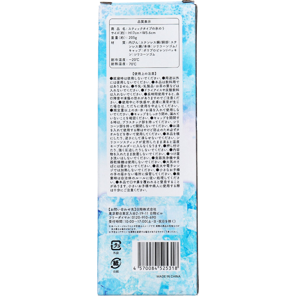 | 素材 | 【商品名】 スティックタイプ氷のう 【材質】 内びん:ステンレス鋼 胴部:ステンレス鋼 本体:シリコーンゴム キャップ:ポリプロピレン パッキン:シリコーンゴム 【サイズ】 約H17cm×W5.6cm 重量:約205g 【耐冷・耐熱温度】 -20度・70度 【使い方】 ★氷のうとして使う ・しっかり凍らせたい場合 (1)シリコーンスティックに水位ラインまで水を入れ、しっかりキャップを閉める。 (2)そのまま冷凍庫で凍らせる。 ※横にしたり、逆さにして凍らせないでください。シリコーンスティックが変形したまま凍ると温度キープホルダーに入らなくなります。 ・すぐに使いたい場合 (1)シリコーンスティックに水と氷を入れ、しっかりキャップを閉める。 ※氷は小さく砕いて入れてください。 ★湯たんぽとして使う (1)シリコーンスティックに70度以下のお湯を入れ、しっかりキャップを閉める。 ※使用時はやけど防止のためタオルなどを巻いてください。 ※熱くなるのでシリコーン部は持たないでください。 |