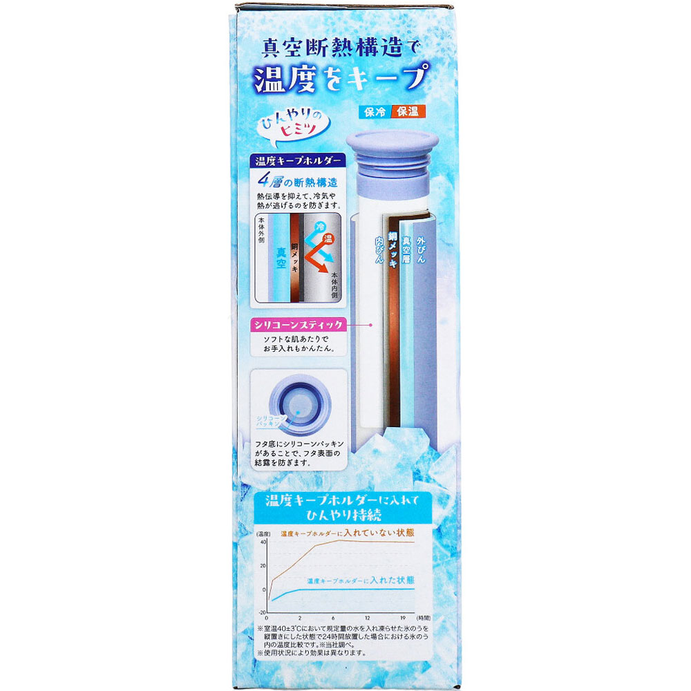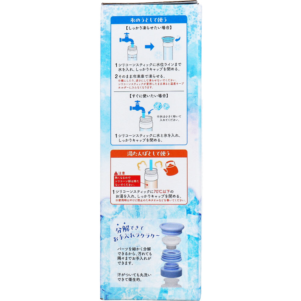 | 注意事項 | 【使用上の注意】 ・就寝時は使用しないでください。 ・用途以外には使用しないでください。 ・本品は飲料用ではありません。 ・牛乳・乳製品・お茶の葉などは入れないでください。 ・ドライアイスや炭酸飲料は入れないでください。 ・長時間使用すると、血行障害や凍傷の恐れがありますのでご注意ください。 ・使用中に不快感や、皮膚に異常が生じた場合は、ただちに使用を中止してください。 ・規定量以上の水・氷・お湯を入れて使用しないでください。 ・キャップをしっかり閉め、漏れていないことを確認ください。 ・キャップを開閉する時は、プラスチック部を持ってください。シリコーン部を持って開閉しないでください。 ・お湯を入れて使用する際はやけど防止のため必ずタオルなどを巻いて使用してください。 ・本品を横にしたり、逆さにして凍らせないでください。シリコーンスティックが変形したまま凍ると温度キープホルダーに入らなくなります。 ・押し付けたり、強く圧迫したりしないでください。 ・内容物を入れたまま放置しないでください。 ・つけ置き洗いはしないでください。 ・食器洗浄機や食器乾燥機は使用しないでください。 ・火気のそばには置かないでください。 ・直火や電子レンジでは加熱しないでください。 ・小さなお子様の手の届かない場所に保管してください。 ・廃棄時は自治体のルールに従い処理してください。 ・本品で口や鼻を覆われると窒息することがあります。小さいお子様や病人に使用する際は十分にご注意ください。 |