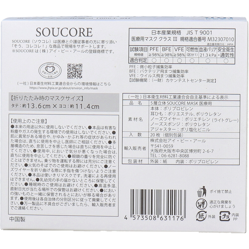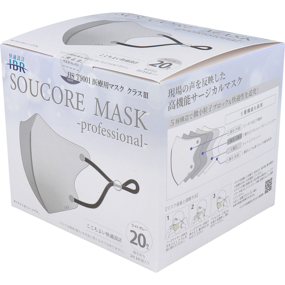 【業務用】5層立体 SOUCORE MASK(ソウコレマスク) 医療用 個別包装 ライトグレー 20枚入