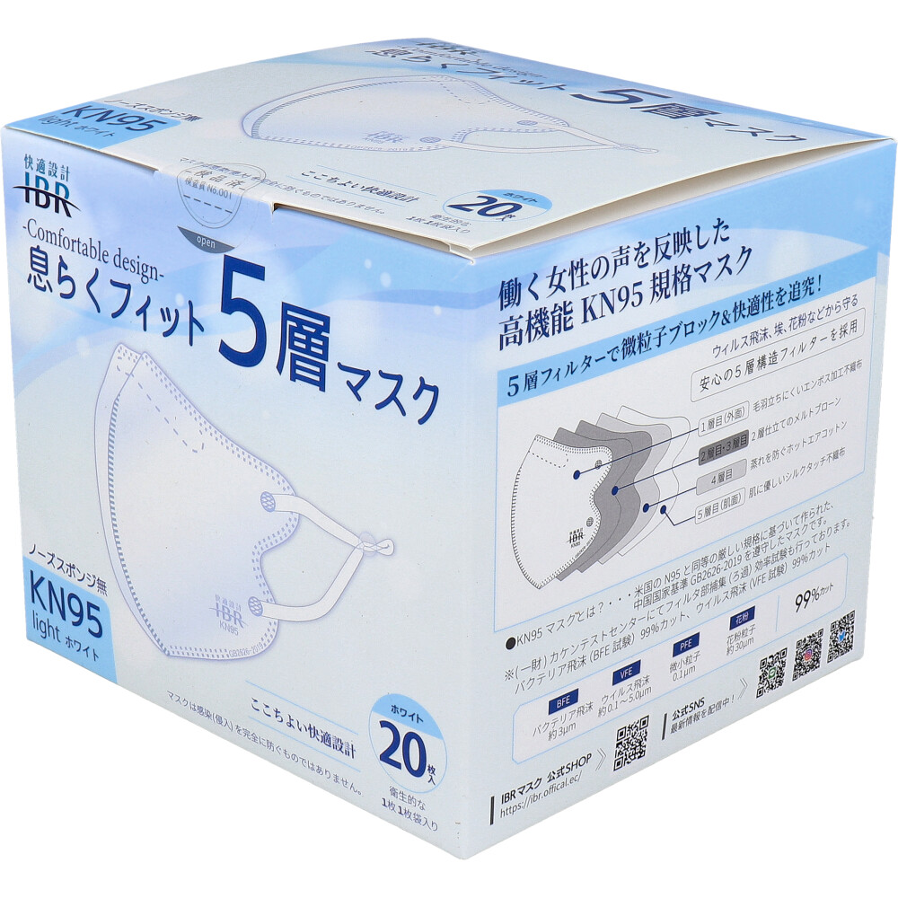 【業務用】KN95 息らくフィット 5層マスク ライト ノーズスポンジ有 個別包装 ホワイト 20枚入