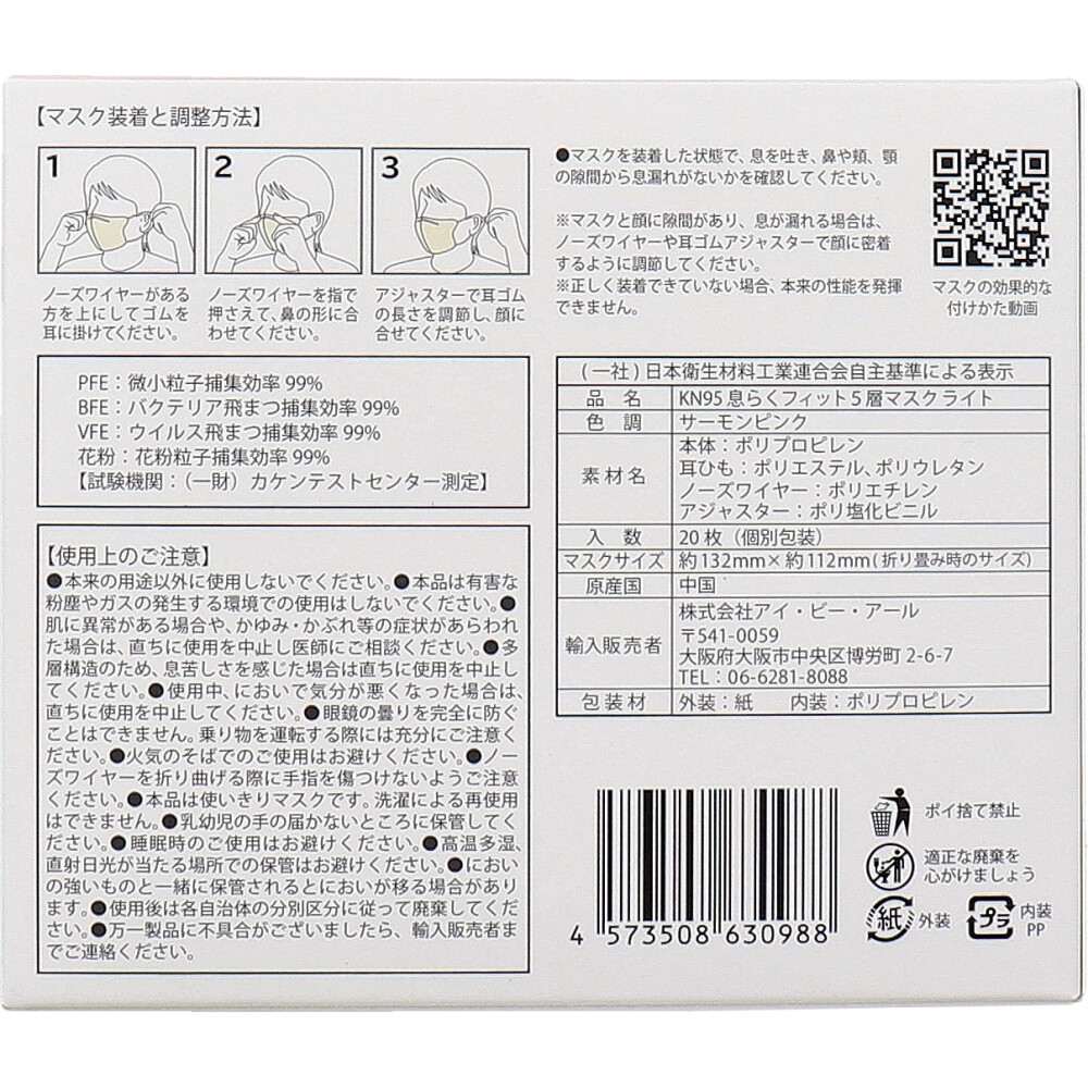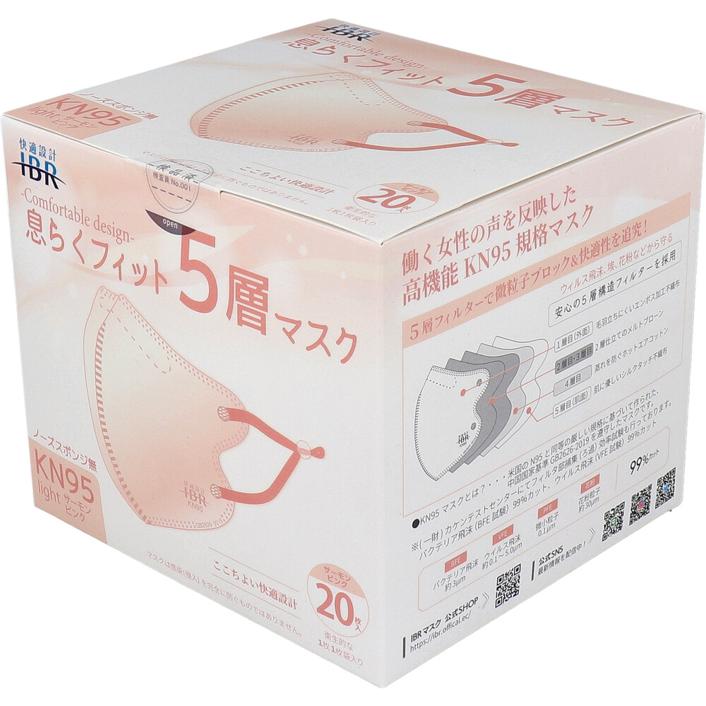 【業務用】KN95 息らくフィット 5層マスク ライト ノーズスポンジ無 個別包装 サーモンピンク 20枚入