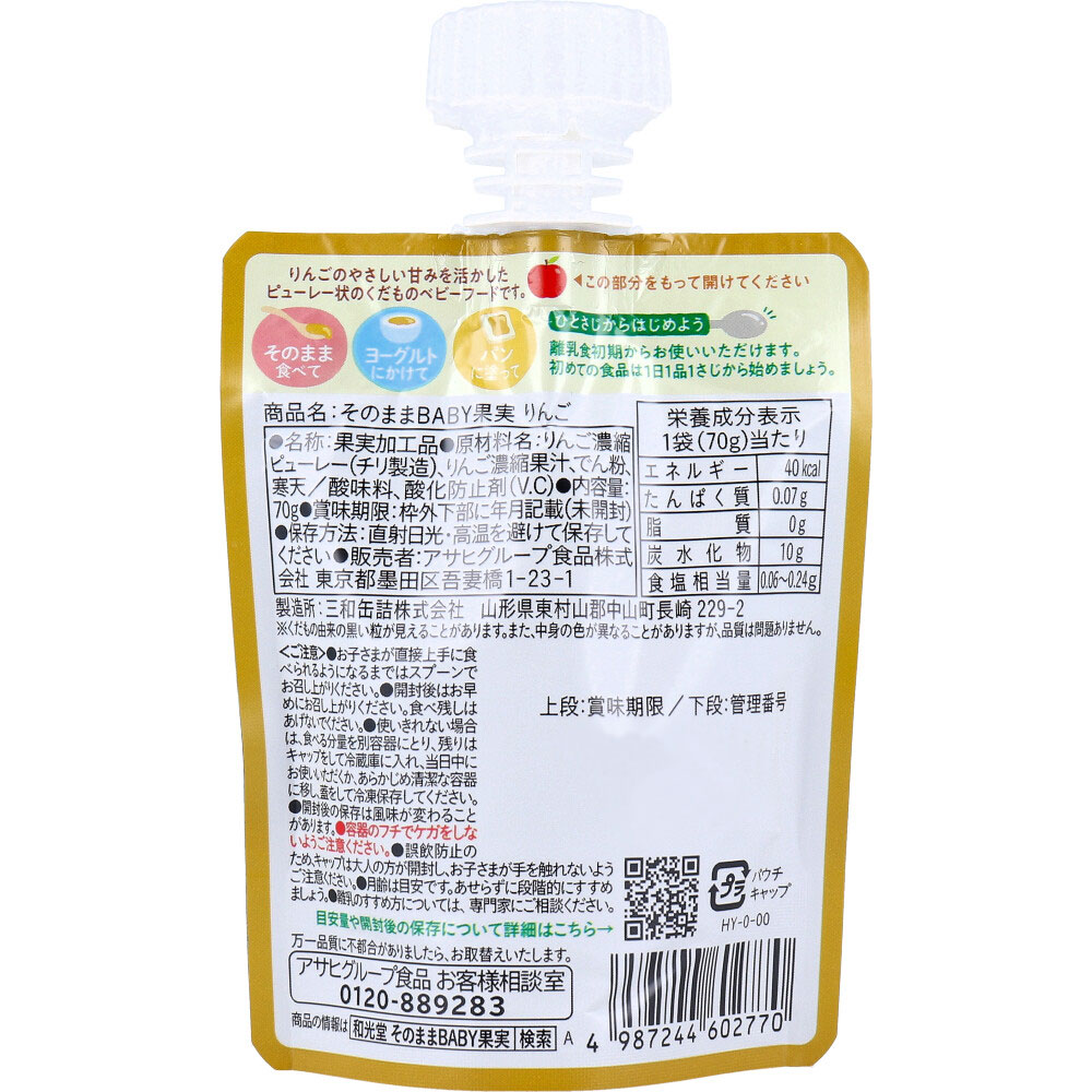 | 素材 | 【名称】 果実加工品 商品名:そのままBABY果実 りんご 【原材料名】 りんご濃縮ピューレー(チリ製造)、りんご濃縮果汁、でん粉、寒天/酸味料、酸化防止剤(V.C) 【原材料に含まれるアレルギー物質(28品目中)】 りんご 【保存方法】 直射日光・高温を避けて保存してください。 【栄養成分表示1袋(70g)当たり】 ・エネルギー:40kcaL ・たんぱく質:0.07g ・脂質:0g ・炭水化物:10g ・食塩相当量:0.06~0.24g |