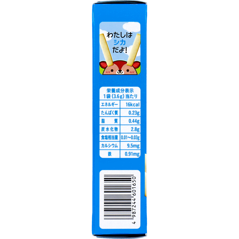 | 素材 | 【名称】 ビスケット 商品名:赤ちゃんのおやつ+Ca カルシウム 鉄入りビスケット 【原材料名】 小麦粉(国内製造)、でん粉、水あめ、ショートニング、砂糖、加糖脱脂練乳、全粉乳、植物油脂、食塩/膨脹剤、炭酸カルシウム、ピロリン酸鉄 【原料に含まれるアレルギー物質(28品目中)】 小麦・乳成分 【栄養成分表示1袋(3.6g)当たり】 ・エネルギー:16kcaL ・たんぱく質:0.23g ・脂質:0.44g ・炭水化物:2.8g ・食塩相当量:0.01~0.03g ・カルシウム:9.5mg ・鉄:0.91mg 【保存方法】 直射日光、高温多湿を避け常温で保存してください。 【こうして食べよう】 ・小さく割ると、食べにくくなり上手にのみこめないことがあります。割らずにそのままあげてください。 ・湿気を嫌いますので、開封後はなるべくお早めにお召し上がりください。 ※間食1回につき1袋を目安にお召し上がりください。 |