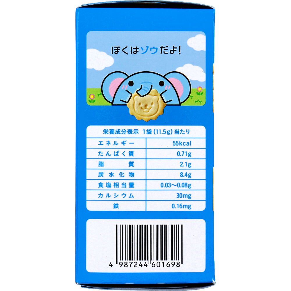 | 素材 | 【名称】 ビスケット 商品名:赤ちゃんのおやつ+Ca カルシウム どうぶつビスケット 【原材料名】 小麦粉(国内製造)、ショートニング、でん粉、水あめ、砂糖、全粉乳、植物油脂、チーズパウダー、食塩/膨脹剤、炭酸カルシウム、ピロリン酸鉄、V.B1 【原料に含まれるアレルギー物質(28品目中)】 小麦・乳成分 【栄養成分表示1袋(11.5g)当たり】 ・エネルギー:55kcaL ・たんぱく質:0.71g ・脂質:2.1g ・炭水化物:8.4g ・食塩相当量:0.03~0.08g ・カルシウム:30mg ・鉄:0.16mg 【保存方法】 直射日光、高温多湿を避け常温で保存してください。 【こうして食べよう】 ・小さく割ると、食べにくくなり上手にのみこめないことがあります。割らずにそのままあげてください。 ※まれに褐色の小片がみられることがありますが、原料の一部ですので安心してお召し上がりください。 ・湿気を嫌いますので、開封後はなるべくお早めにお召し上がりください。 ※間食1回につき1袋を目安にお召し上がりください。 |