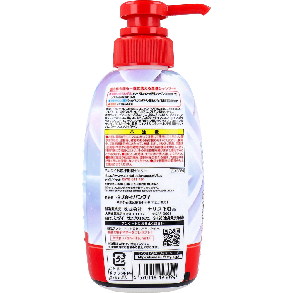| 素材 | 【化粧品】 全身用洗浄料 販売名:バンダイゼンプウォッシュSH26 【全成分】 水、ラウレス硫酸Na、ココアンホジ酢酸2Na、コカミドDEA、ソルビトール、塩化Na、ラウロイルアスパラギン酸Na、セリン、水溶性コラーゲン、オリーブ葉エキス、甘草エキス、DPG、ジステアリン酸グリコール、クエン酸、コカミドプロピルベタイン、ココベタイン、ポリクオタニウム-10、ラウレス-6カルボン酸、ラウラミノプロピオン酸Na、BG、EDTA-2Na、香料、フェノキシエタノール、安息香酸Na、メチルパラベン、エチルパラベン 【使用方法】 ・適量を手に取り、水又はぬるま湯でよく泡立ててご使用ください。その後、十分に洗い流してください。 ・髪を洗う場合は、髪をお湯で濡らしてから、シャンプーしてください。 ★ポンプの使い方 ・使い始めはポンプ下部を片手でおさえながら、ノズルを回し、上げてください。 ※ノズルを逆に回すとポンプが上がらなくなる場合があります。 |