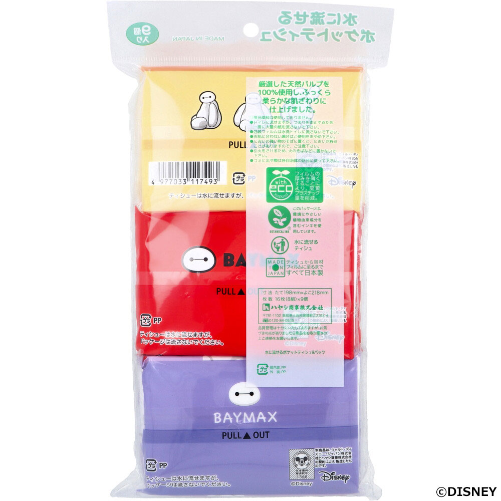 [メーカー欠品]ベイマックス 水に流せるポケットティシュ 16枚(8組)×9個入